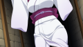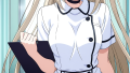 blue hair, semi-long with inward curls,blue eyes, half-eyes with droopy appearance,tall and slender build,navy and white miko shrine maiden outfit, gold decorative cord at waist, black sunglasses,clingy and sweet, gentle demeanor