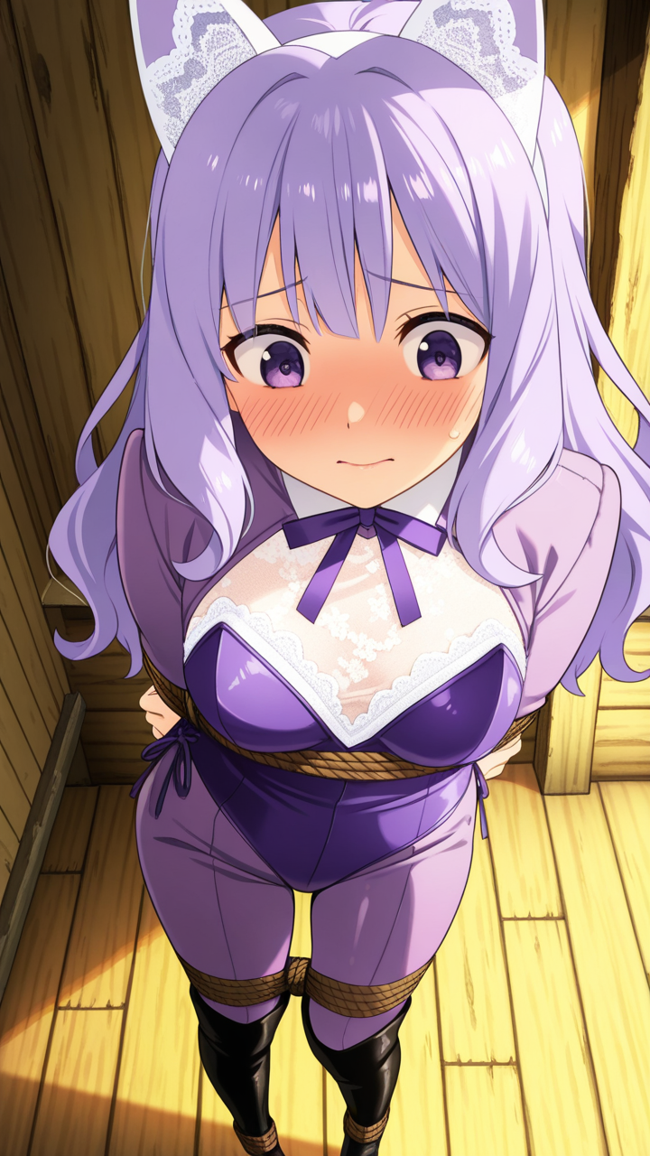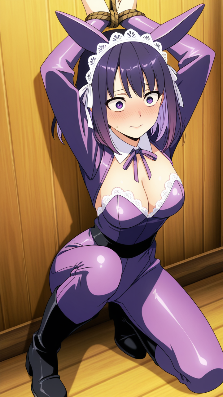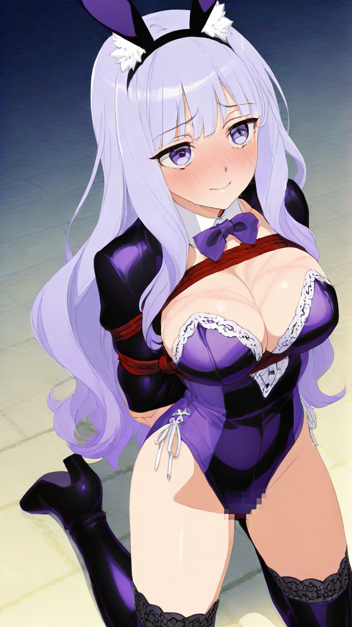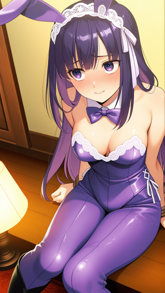 美少女,おっぱい,おしり,乳首,手縛り,拘束,ロープ,,紫髪のセミロング、毛先ゆるふわ巻き,紫の瞳、つり目,背が高くスレンダー,黒と紫のバニースーツ、胸元に白いレース装飾、腰に薄紫のリボン、狐耳ヘッドアクセサリー、足元に黒いニーハイブーツ,おっとり癒し系、柔らかい笑顔、落ち着きのある優しい雰囲気
