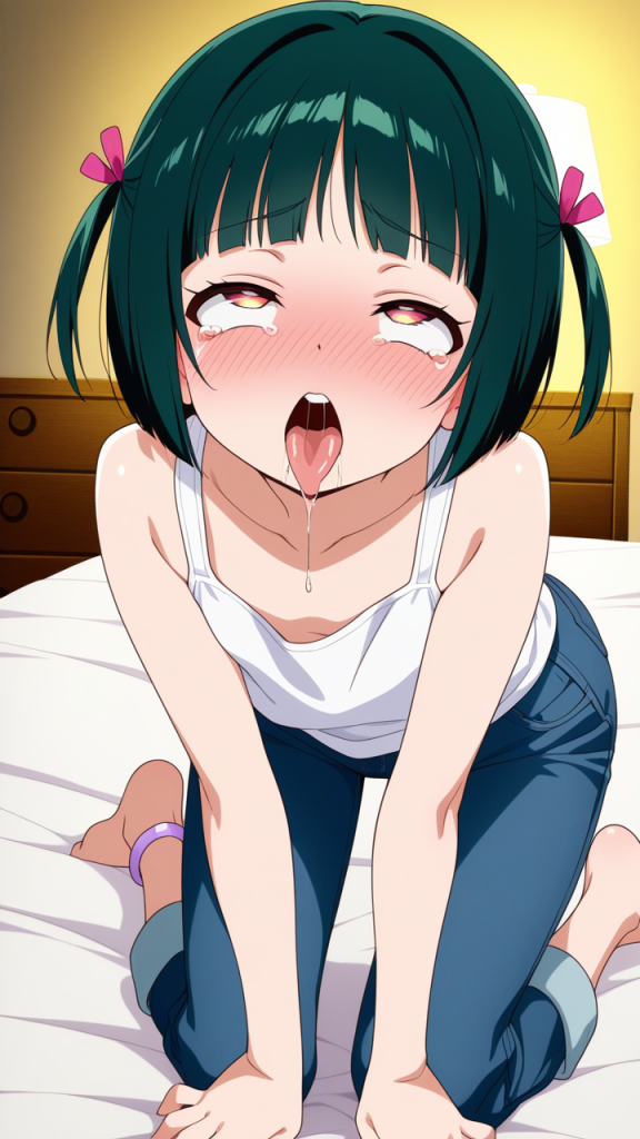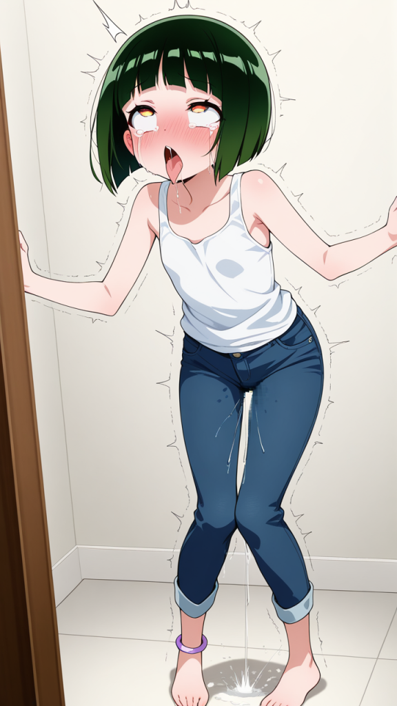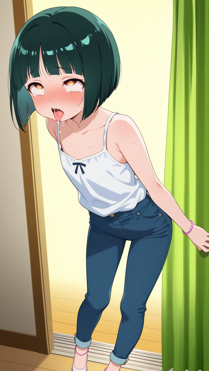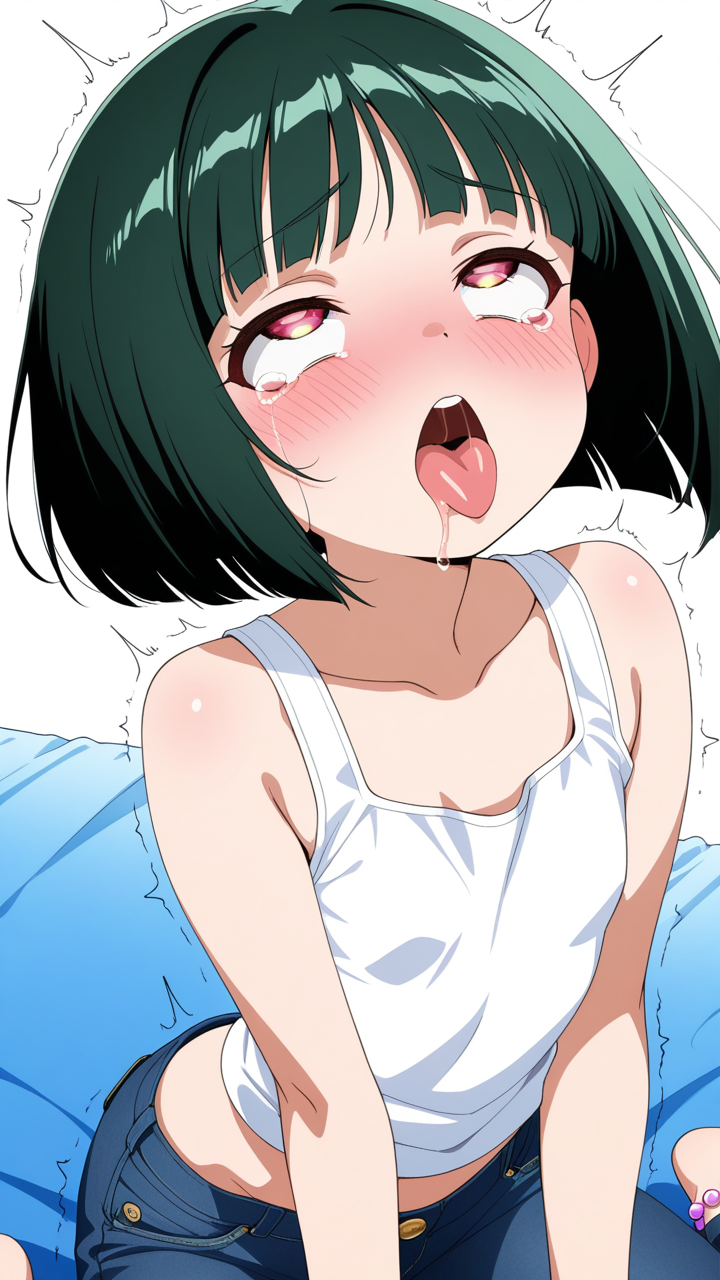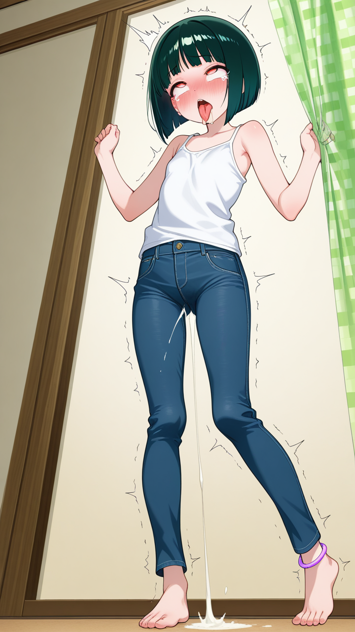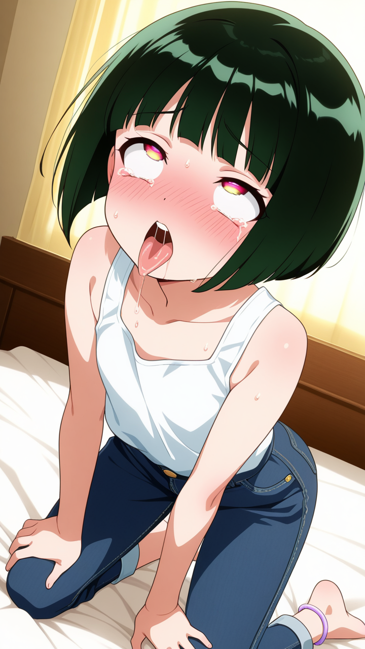美少女,おっぱい,おしり,乳首,アヘ顔,白目,舌出し,よだれ,,深緑のボブカット,琥珀色の切れ長の瞳,ロリ体型,紺のカジュアルジーンズ、白いタンクトップ、足首に薄紫のアンクレット,天然ドジっ子で、ほんわかとした雰囲気