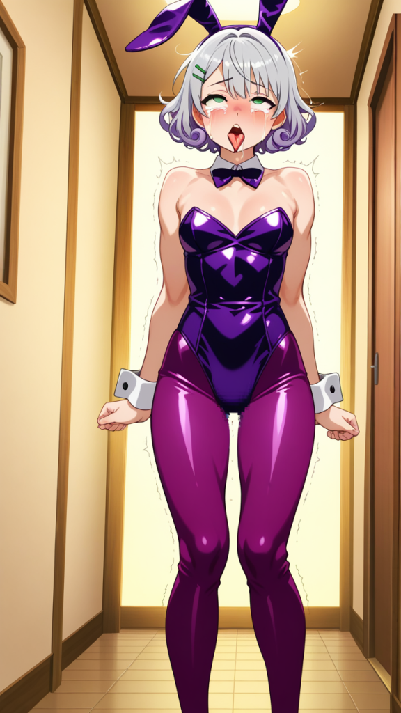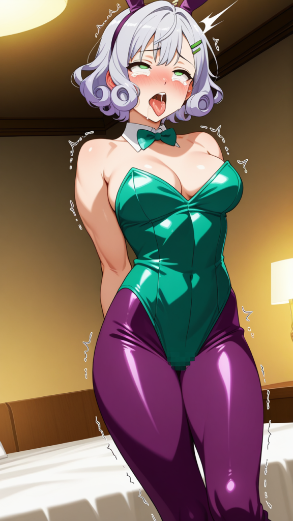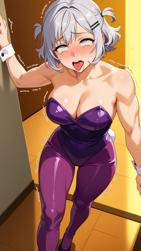 美少女,おっぱい,おしり,乳首,アヘ顔,白目,舌出し,よだれ,,マゼンタピンク色のくせ毛ショート,翠色の垂れ目気味ハーフ目,スポーティーで引き締まった筋肉質な体型,黒と紫のバニースーツ、シルバーのヘアピン,おっとりとした癒し系で、温厚で優しい雰囲気
