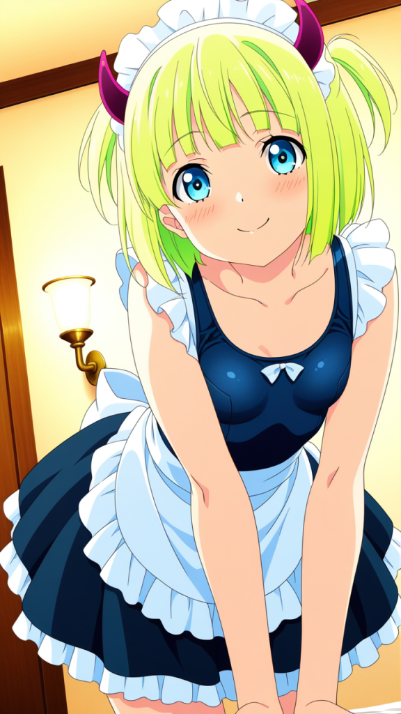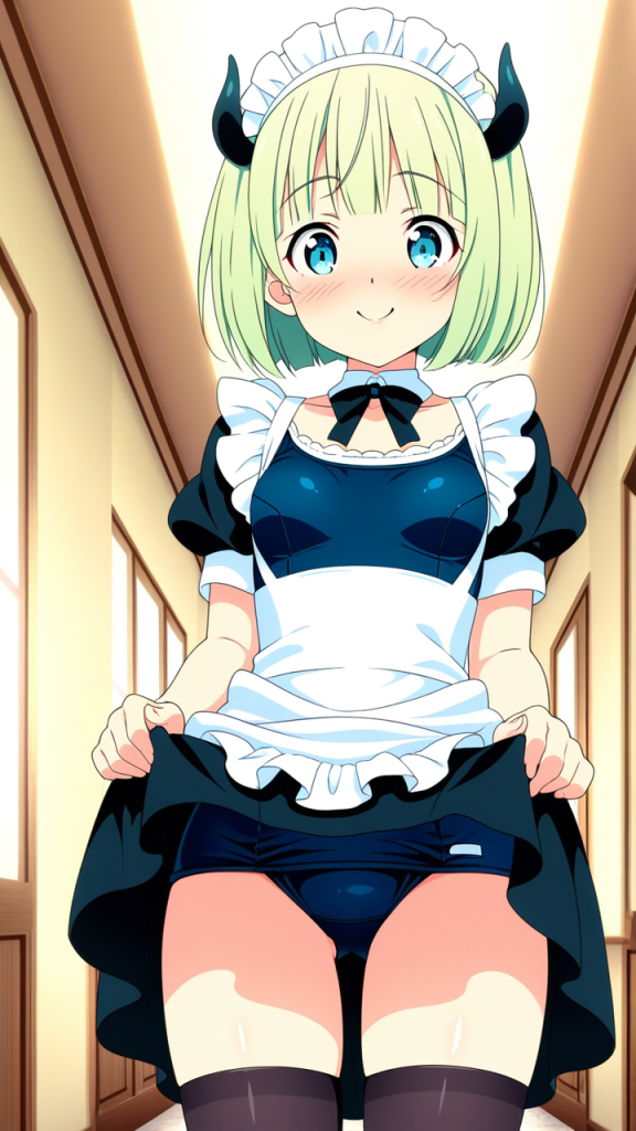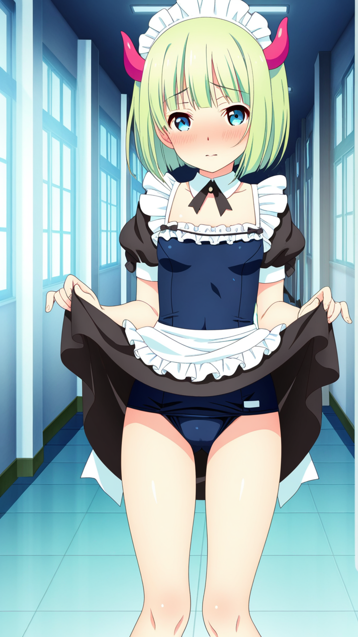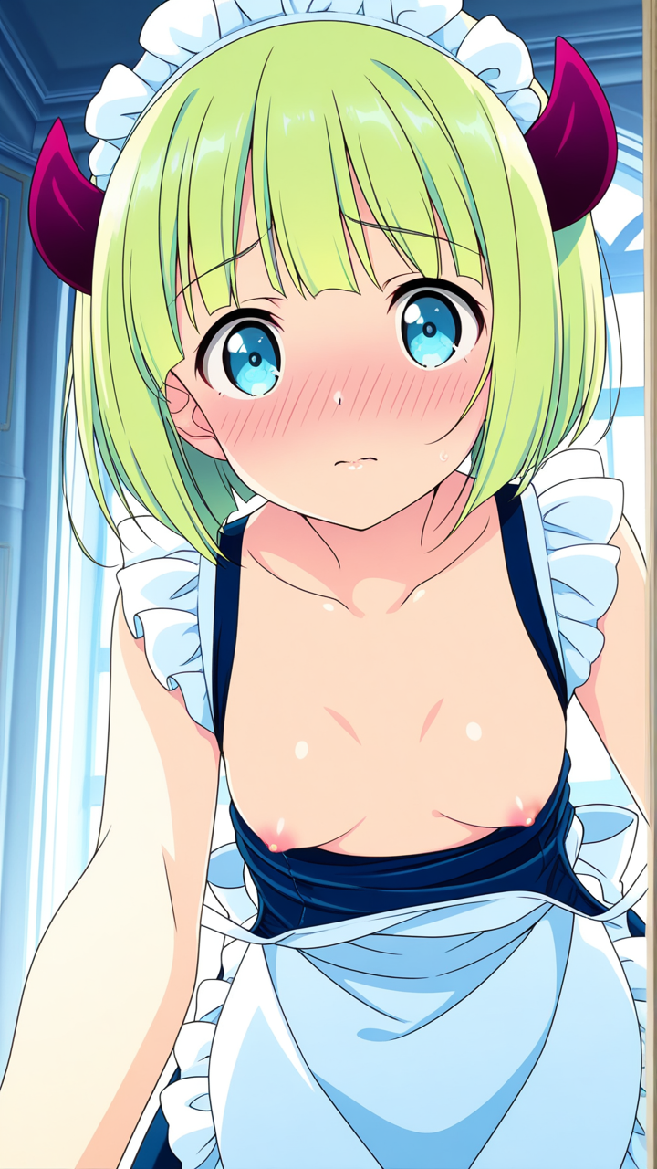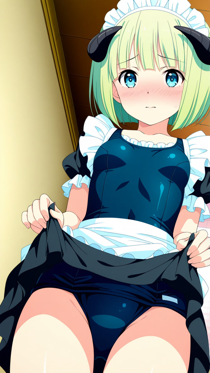 美少女,おっぱい,乳首,メイド,メイド服,コスプレ,,ライム色の外ハネボブ,水色の細めのクールな瞳,貧乳・小柄,スクール水着、悪魔の角アクセサリー,純粋無垢