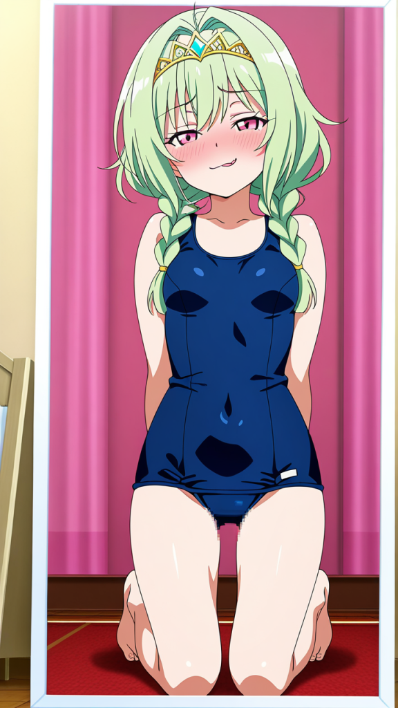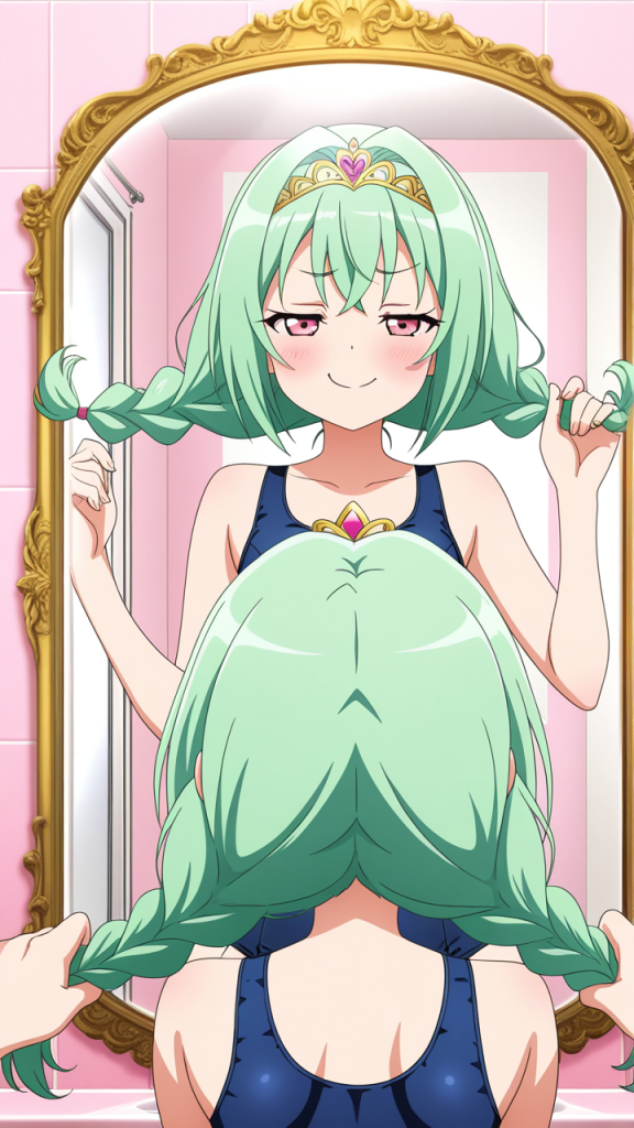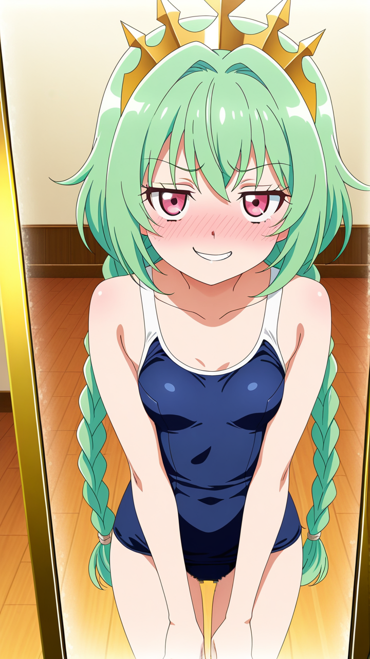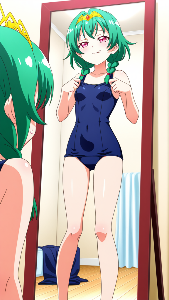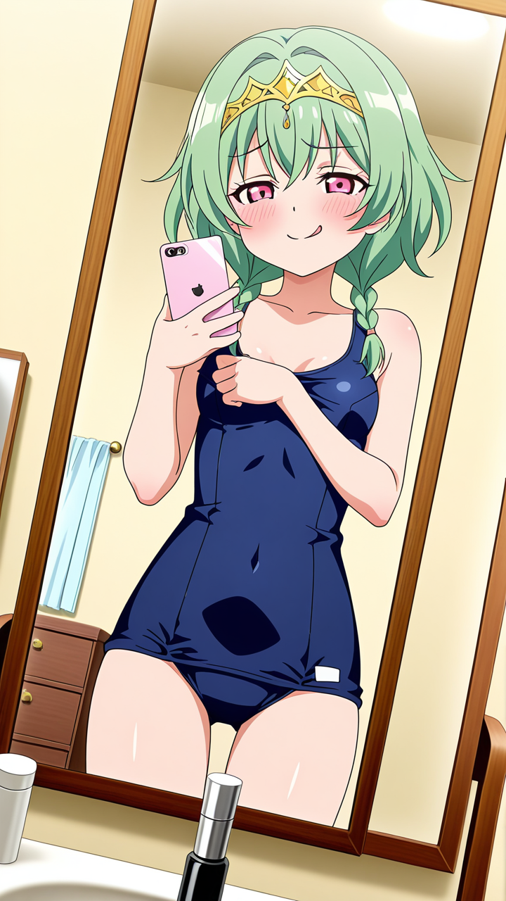 美少女,おっぱい,おしり,乳首,鏡,反射,鏡越し,,緑髪のツインおさげ,ピンクの瞳、ハーフっぽい二重まぶた,貧乳・長身,スクール水着、金色のヘッドドレス,腹黒系、ニヤリと笑う表情