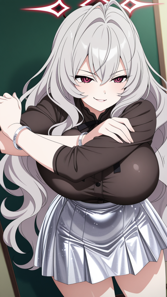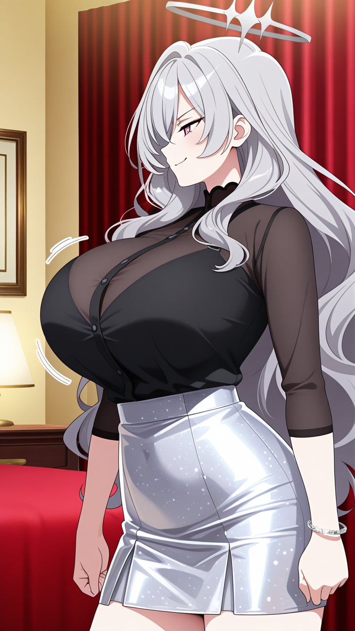 美少女,巨乳,おっぱい,乳首,爆乳,むっちり,,グレー髪のウェーブロング,深紅の瞳、たれ目,グラマラス,黒いシースルーブラウス、銀色のサテンスカート、天使の輪、腕に細い銀色のブレスレット,勝ち気で負けず嫌い、自信に満ちた表情