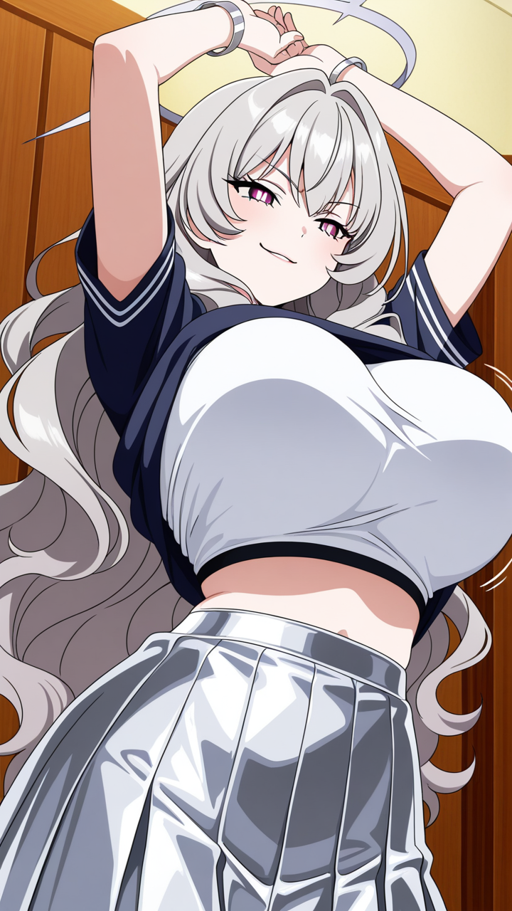 gray wavy long hair,deep crimson eyes, puppy dog eyes,glamorous, voluptuous figure,black sheer blouse, silver satin skirt, halo accessory, silver bracelet on wrist,competitive, determined, confident smirk