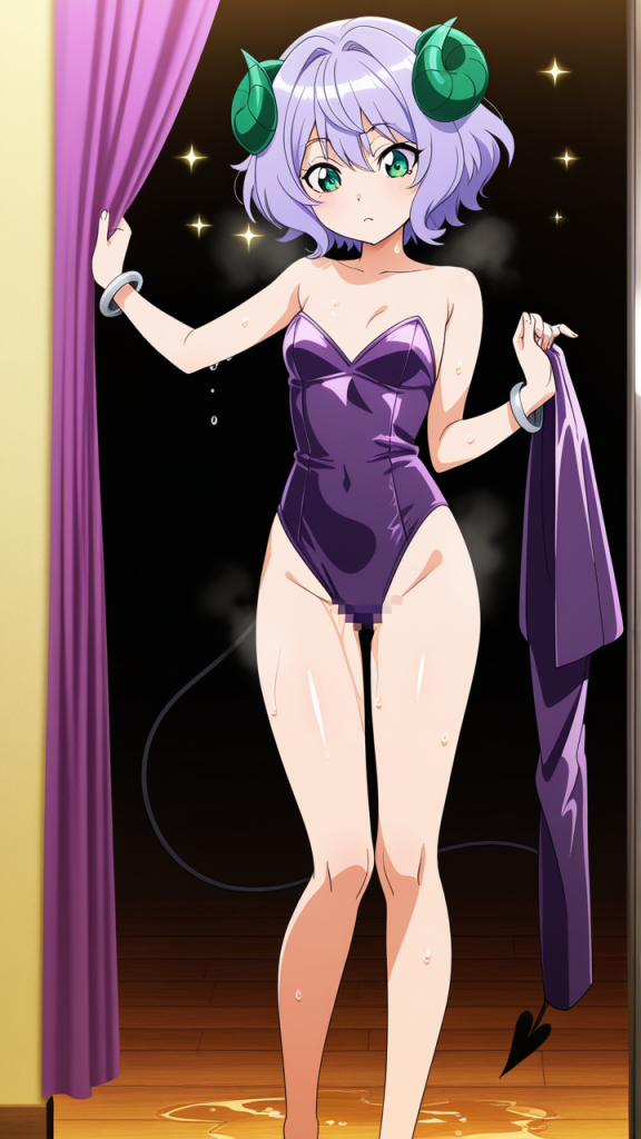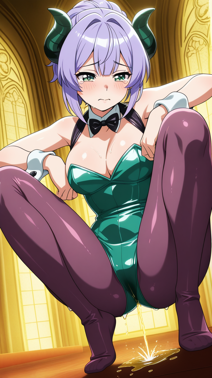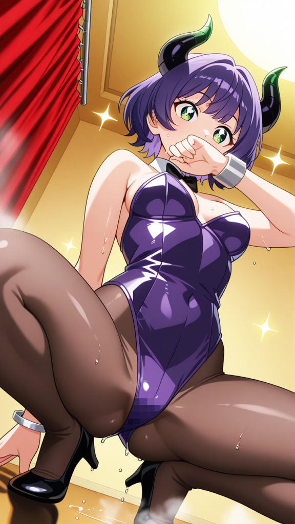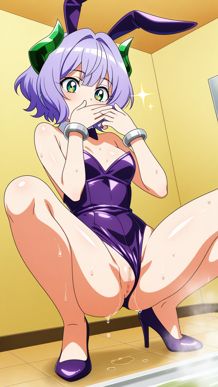 美少女,おっぱい,おしり,M字開脚,食い込み,乳首,パンツ,くぱぁ,おしっこ,お漏らし,放尿,,紫髪のショートカット,翠色の丸くてキラキラした瞳,背が高くスレンダーな体型,黒と紫のバニースーツ、悪魔の角アクセサリー、腕に銀色のブレスレット,毒舌で気が強く、クールな態度だが本当は優しい