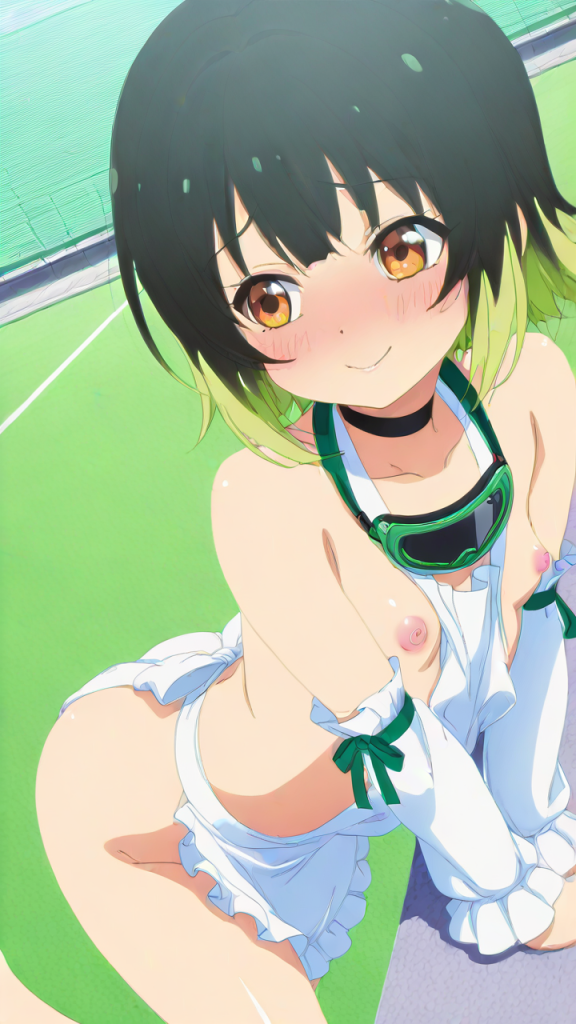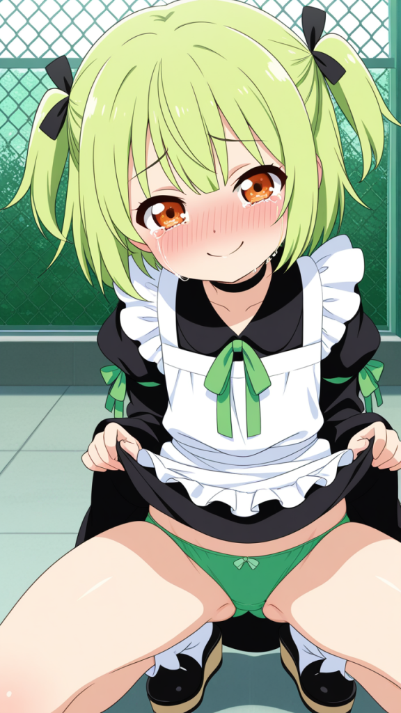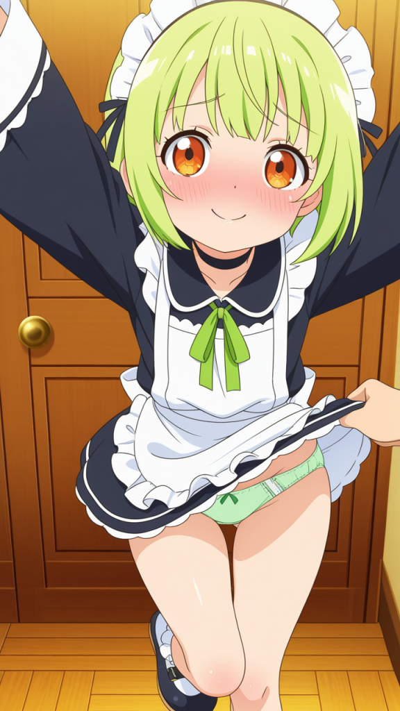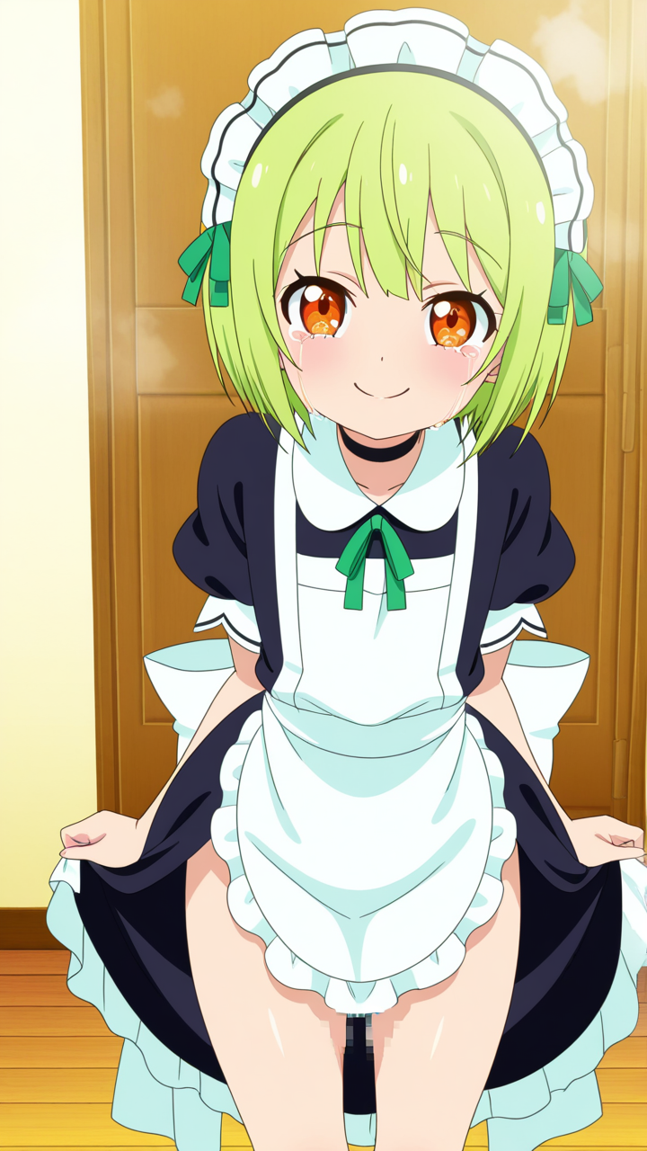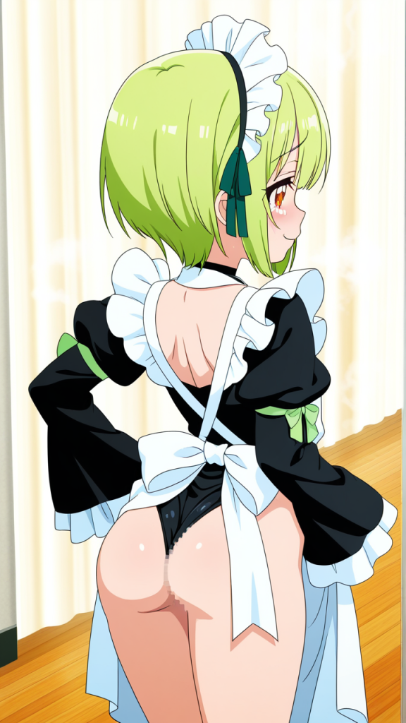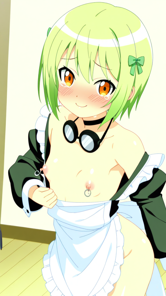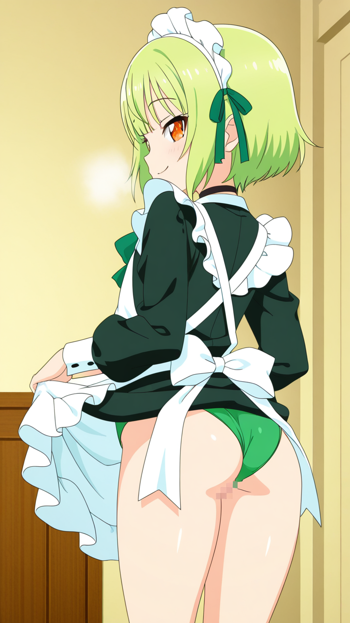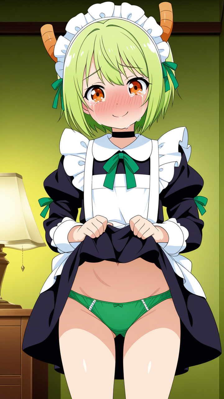 美少女,おっぱい,おしり,M字開脚,食い込み,乳首,パンツ,くぱぁ,バック,後背位,,ライム色のショートカット,橙色の垂れ目気味ハーフ目,ロリ体型,黒と緑を基調としたドラゴンメイド服、白いエプロン、首元に黒いチョーカー、袖口に緑のリボン,腹黒系で笑みを浮かべている