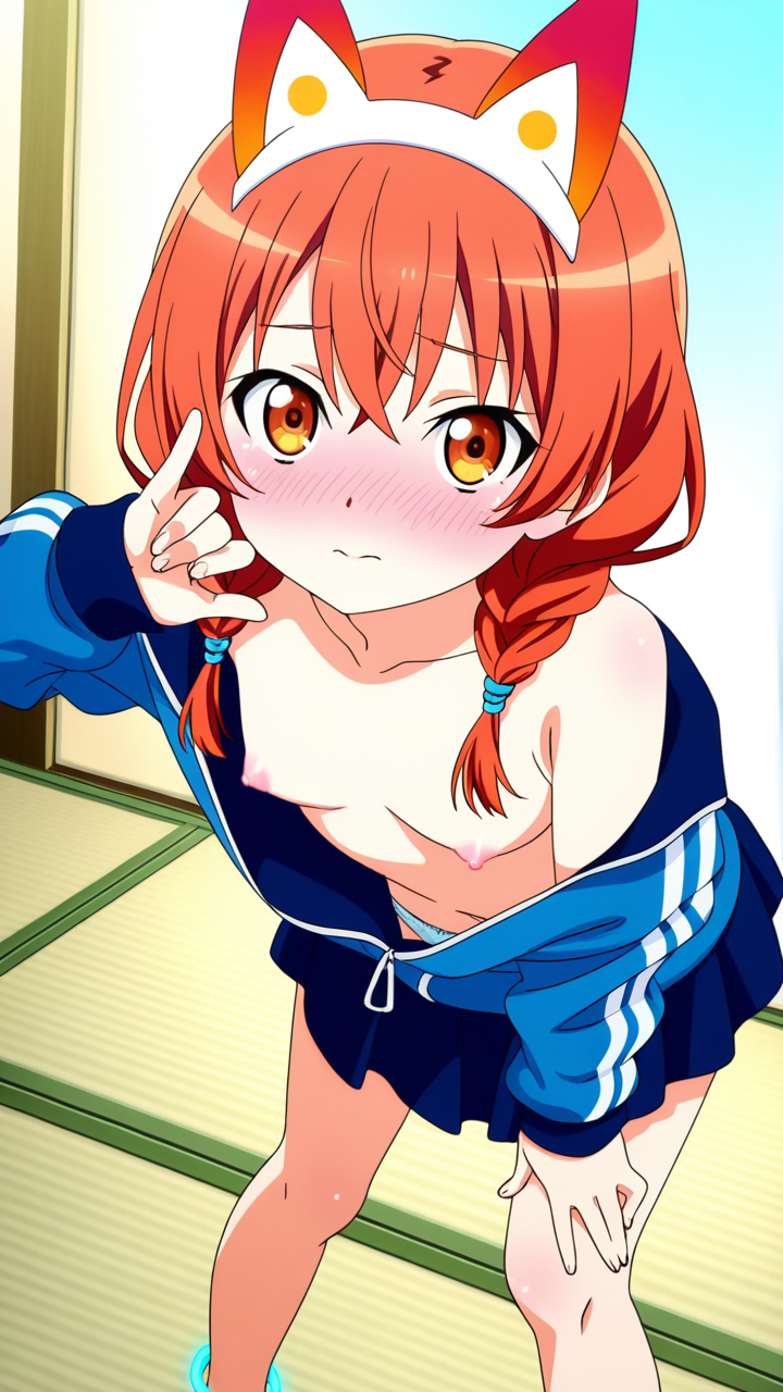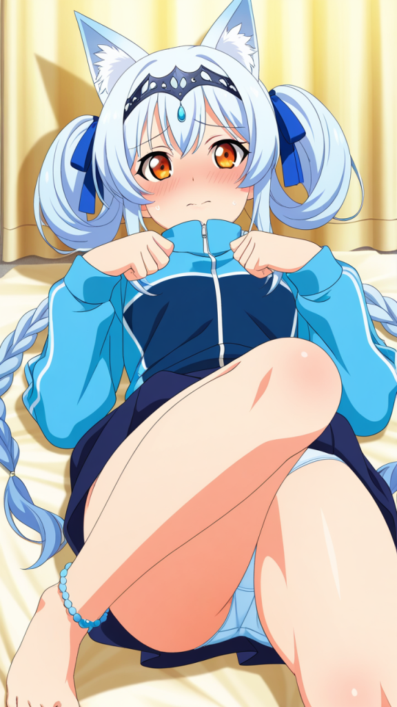 美少女,おっぱい,おしり,M字開脚,乳首,パンツ,くぱぁ,開脚,,黒から青へのグラデーション三つ編み,琥珀色のハーフっぽい二重瞳,小柄でふっくらとした体型,黒と青のジャージ、狐耳ヘッドアクセサリー、足首に青いリボン,気品あるお嬢様だが運動好きで親しみやすい
