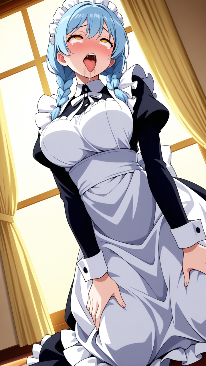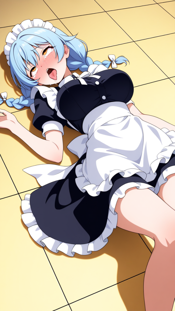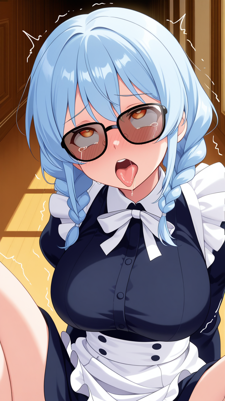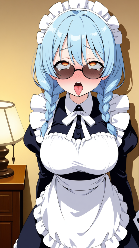 美少女,おっぱい,おしり,乳首,アヘ顔,白目,舌出し,よだれ,,青髪のツインおさげ,琥珀色の細めのクールな瞳,巨乳・スレンダー,黒と紺のメイド服、白いエプロン、黒いサングラス、腰に白いリボン,クール・無口・冷徹