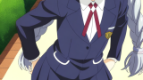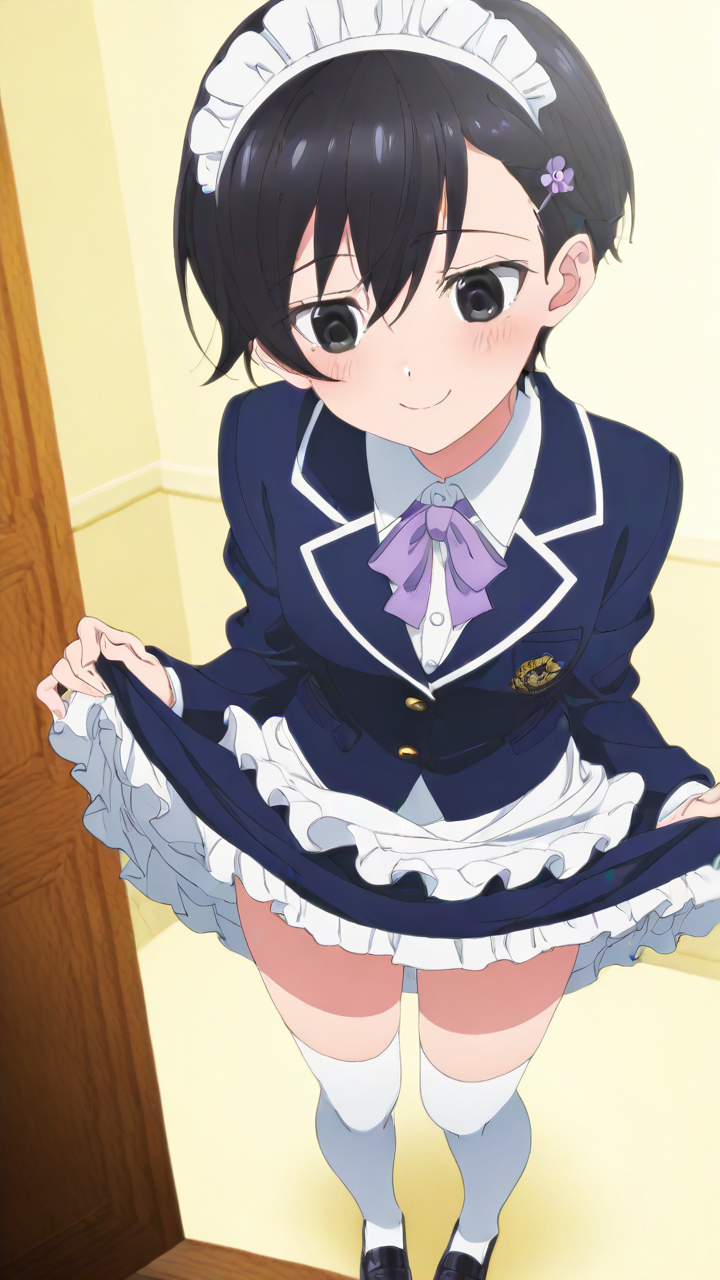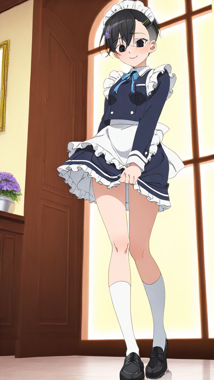 美少女,おっぱい,乳首,メイド,メイド服,コスプレ,,黒から青へのグラデーション刈り上げショート,黒い瞳の細めのクールな目,細身・長身モデル体型,学校制服ブレザー、白いシャツ、紺スカート、白いソックス、黒いローファー、髪飾りに小さな紫の花,腹黒系で口数少なく、冷めた笑顔を浮かべる