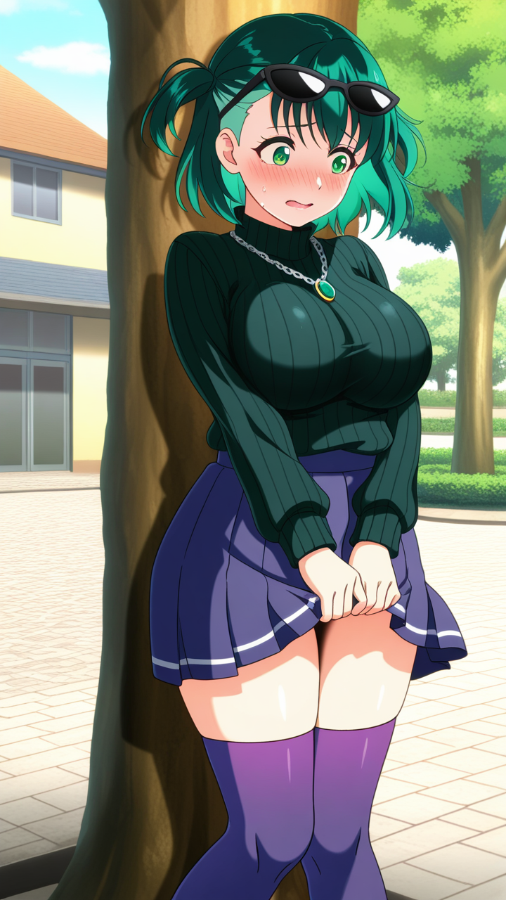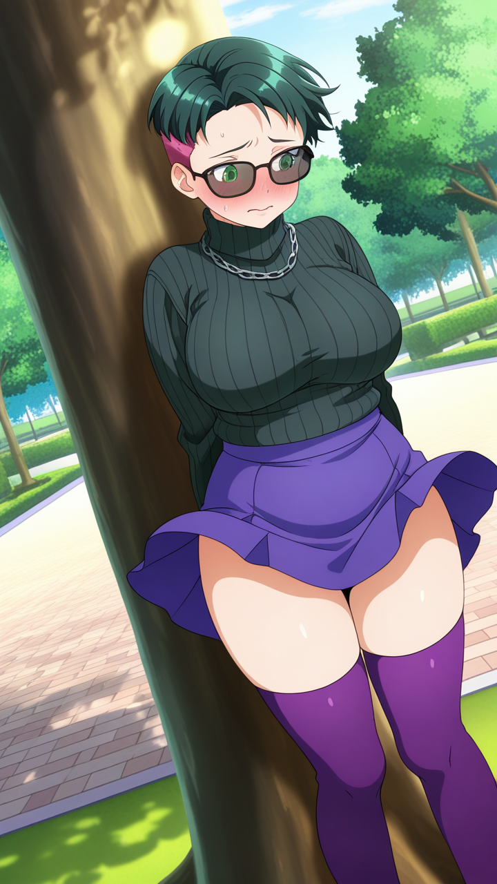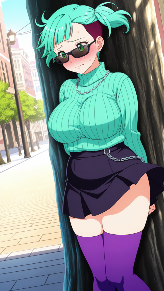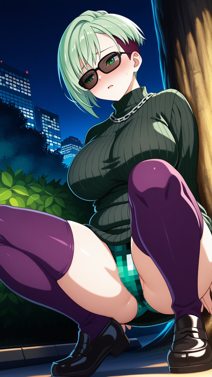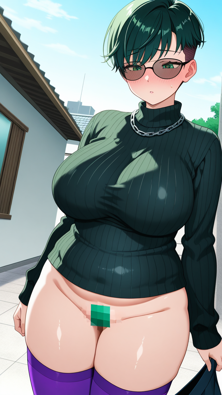 美少女,おっぱい,おしり,乳首,野外露出,露出,屋外,,金からピンクへのグラデーション刈り上げショート,翠色の瞳、ハーフっぽい二重,巨乳・むっちり体型,黒いニットセーター、紫のニーソックス、黒いサングラス、腰に銀色のチェーン,クール・無口・ミステリアス