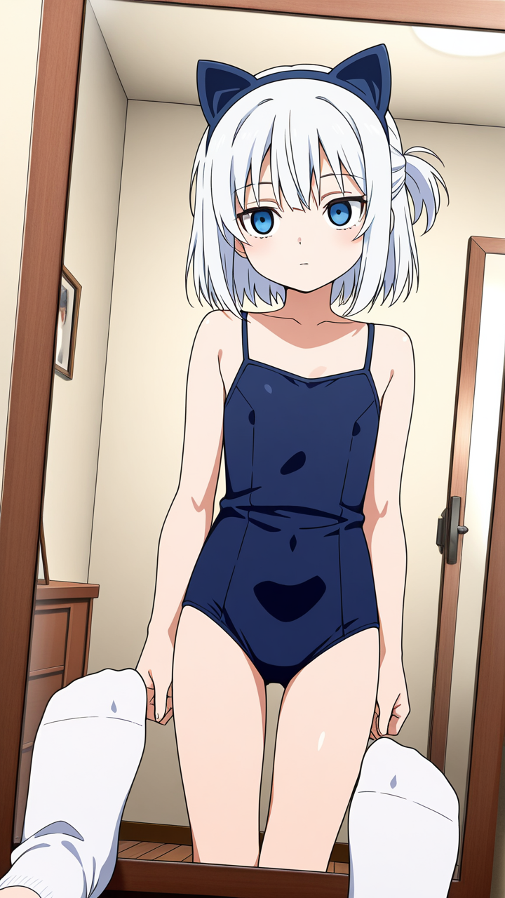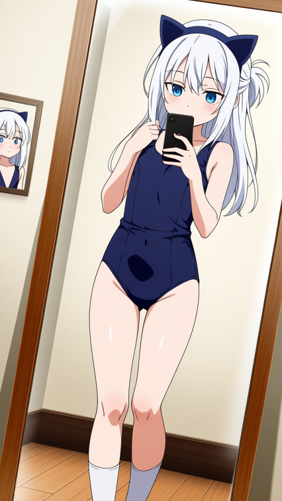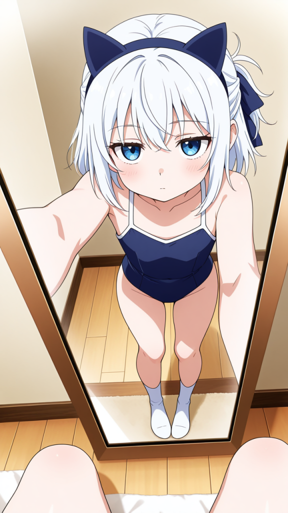 美少女,おっぱい,おしり,乳首,鏡,反射,鏡越し,,白髪のハーフアップ,青い瞳のつり目,貧乳・長身,紺色の体操服、白いソックス、猫耳ヘッドバンド,クール・無口・表情に乏しい