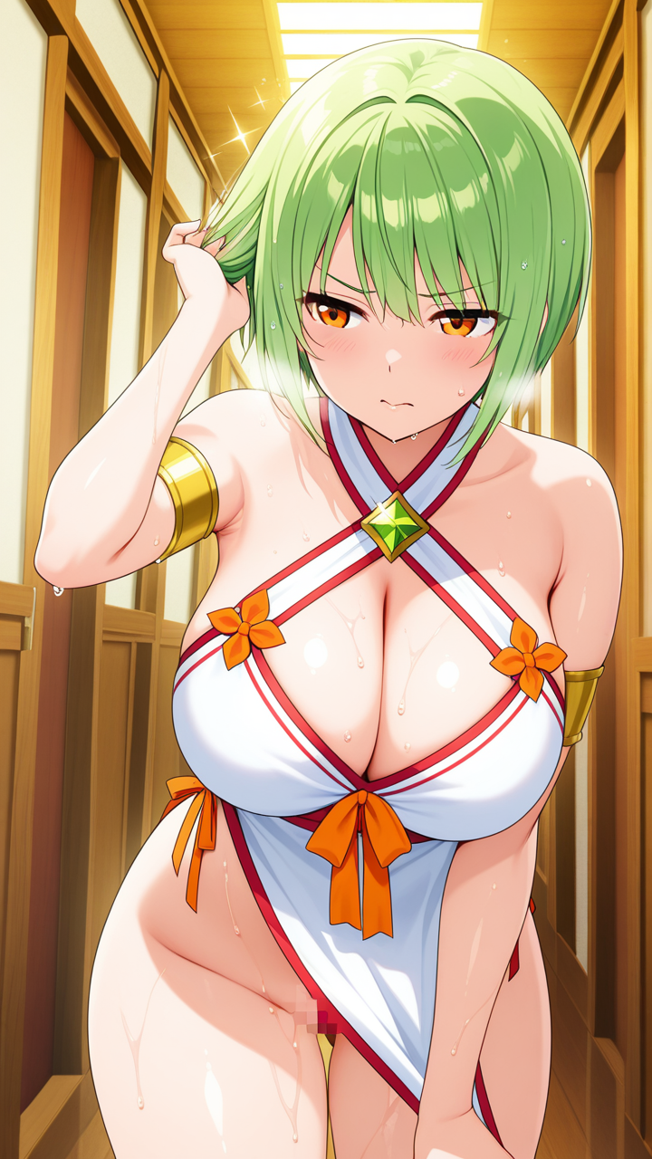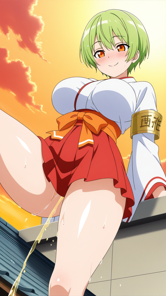 美少女,おっぱい,おしり,M字開脚,食い込み,乳首,パンツ,くぱぁ,おしっこ,お漏らし,放尿,,ライムグリーンのショートカット,橙色の瞳、垂れ目気味のハーフ目,グラマラス,赤と白の巫女服、胸元に大きな橙色のリボンタイ、腕には金色のアームバンド,勝ち気で負けず嫌い、自信満々で挑発的