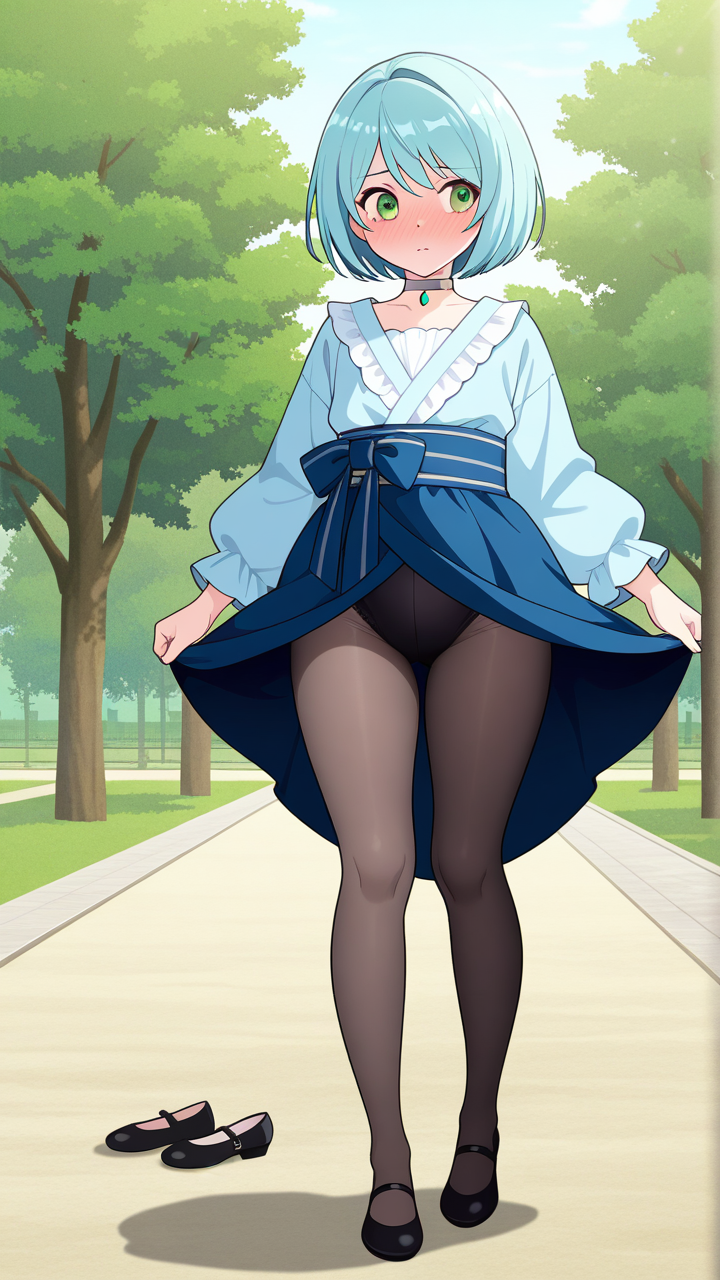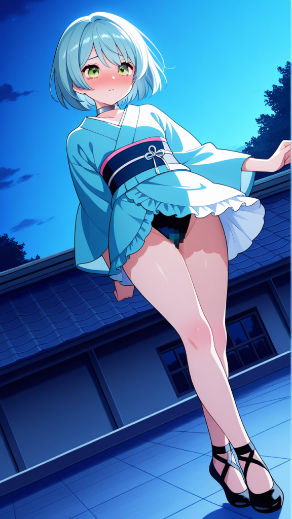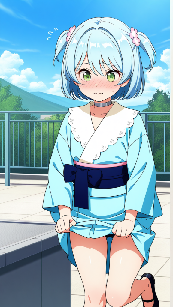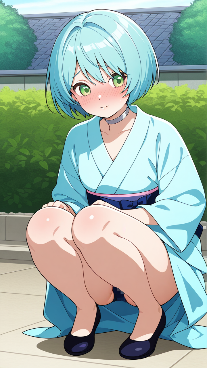 美少女,おっぱい,おしり,乳首,野外露出,露出,屋外,,水色のショートカット,緑の瞳、細めのクールな目,小柄でむっちりとした体型,紺色の帯締めの着物に白いブラウスを重ねた和洋折衷スタイル、銀色のチョーカー、黒いバレエシューズ,純粋無垢で素直、時々おっちょこちょい