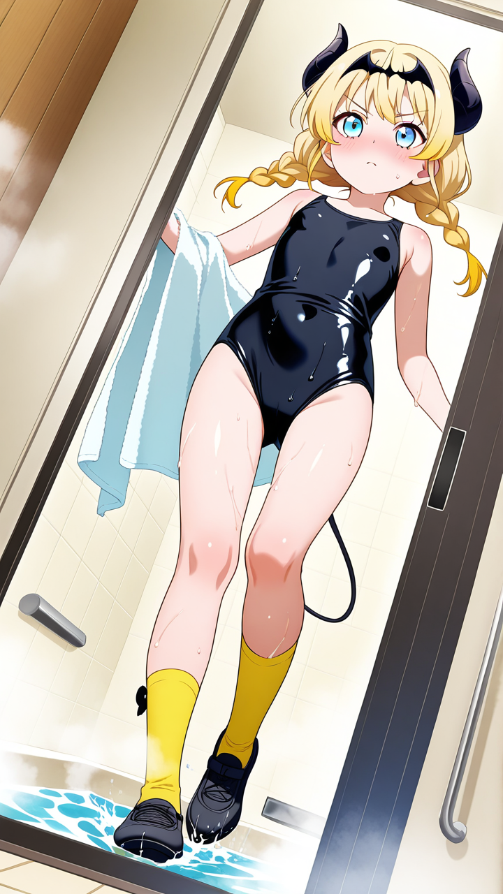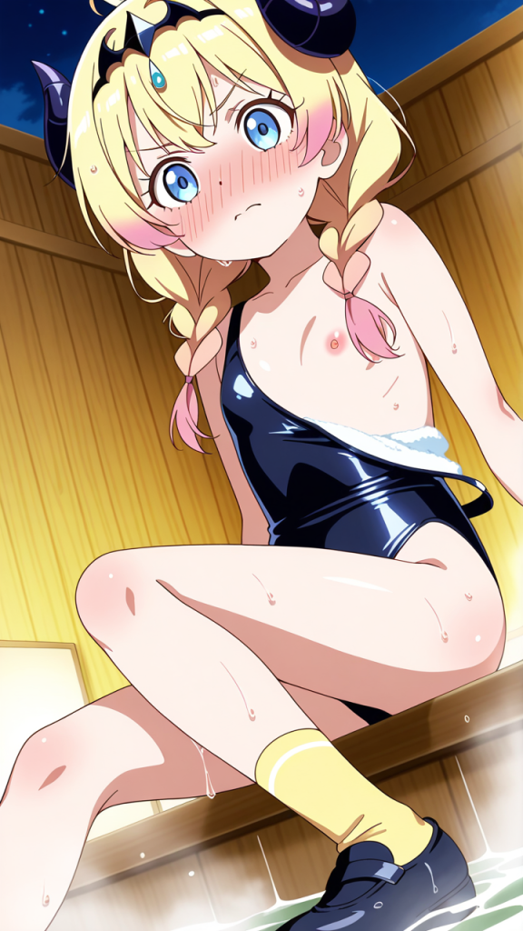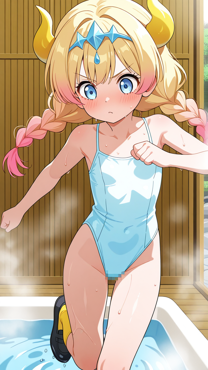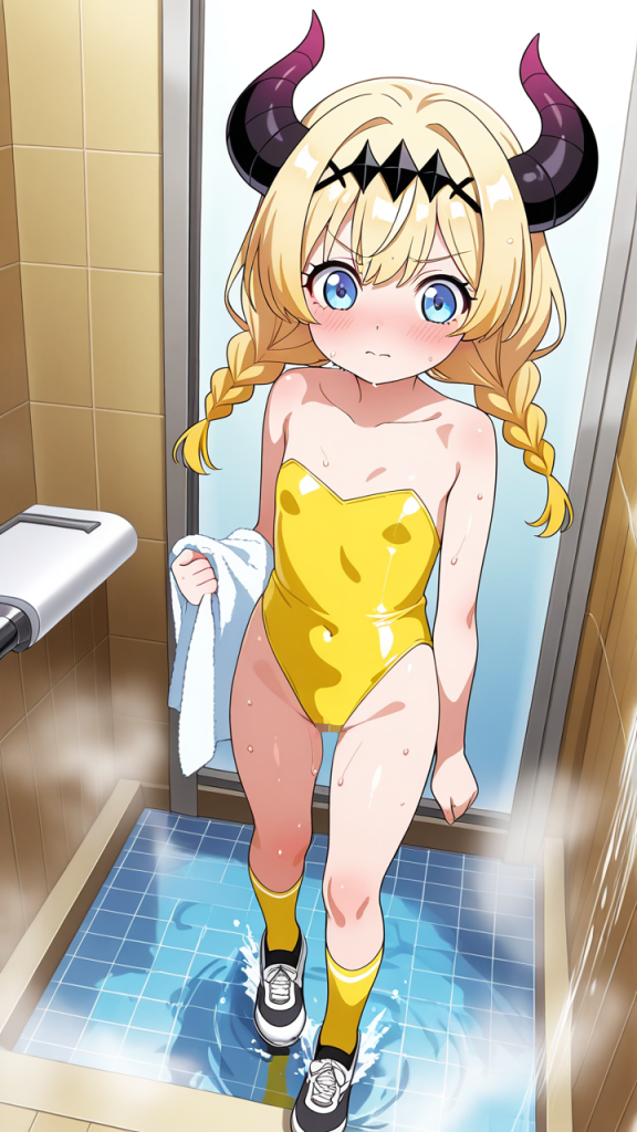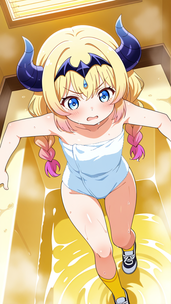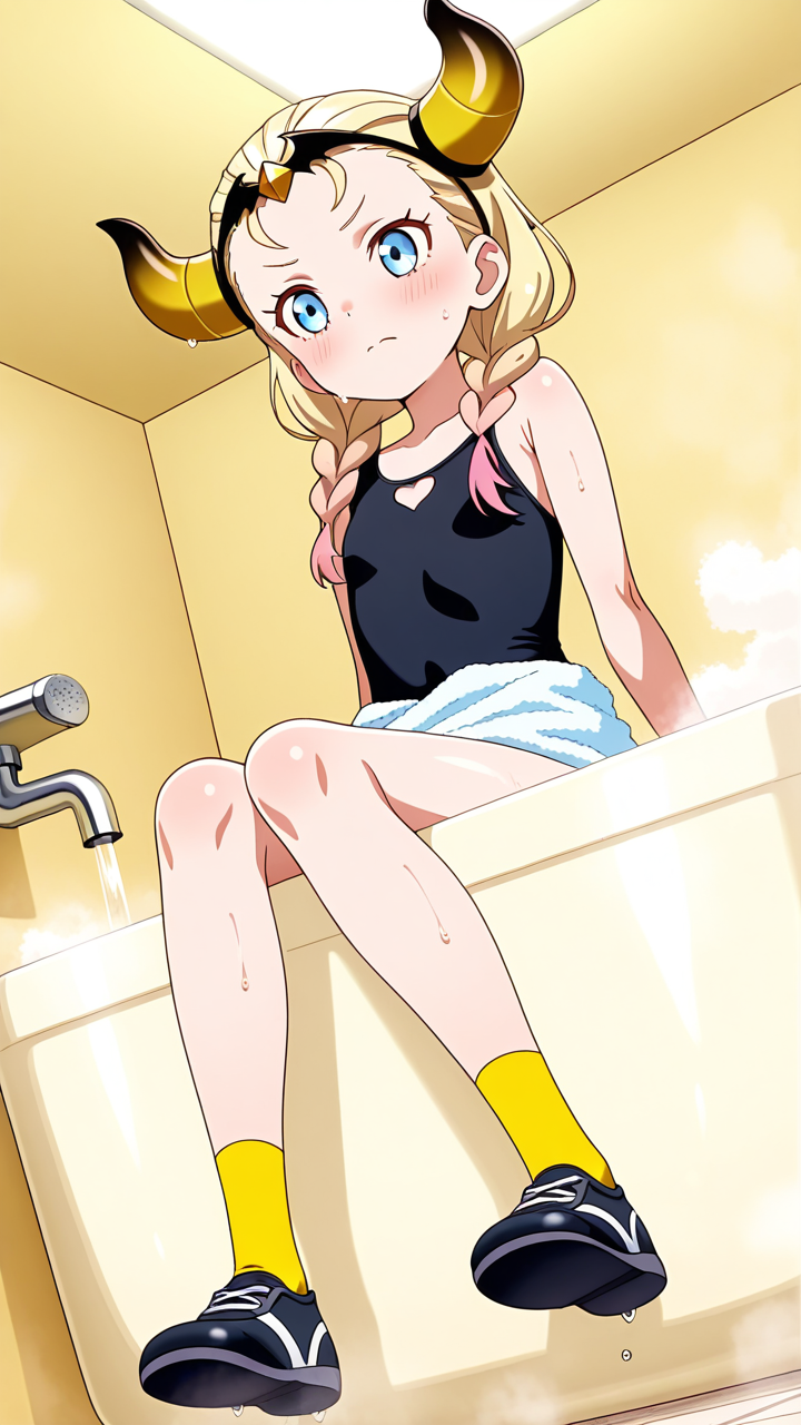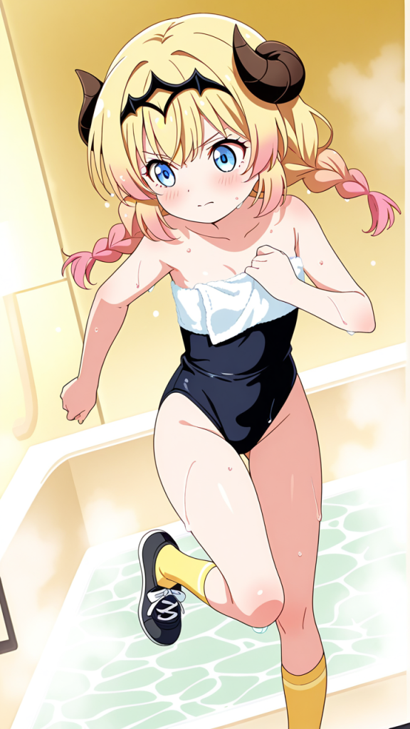 美少女,おっぱい,おしり,乳首,風呂,入浴,温泉,シャワー,,金からピンクへのグラデーション、ツインおさげ,水色の瞳、大きなぱっちり目,ロリ体型,黄色と黒のツートーン体操服、悪魔の角ヘッドアクセサリー、黄色いスポーツソックス、黒いランニングシューズ,勝ち気で負けず嫌い、常に全力で挑戦する姿勢