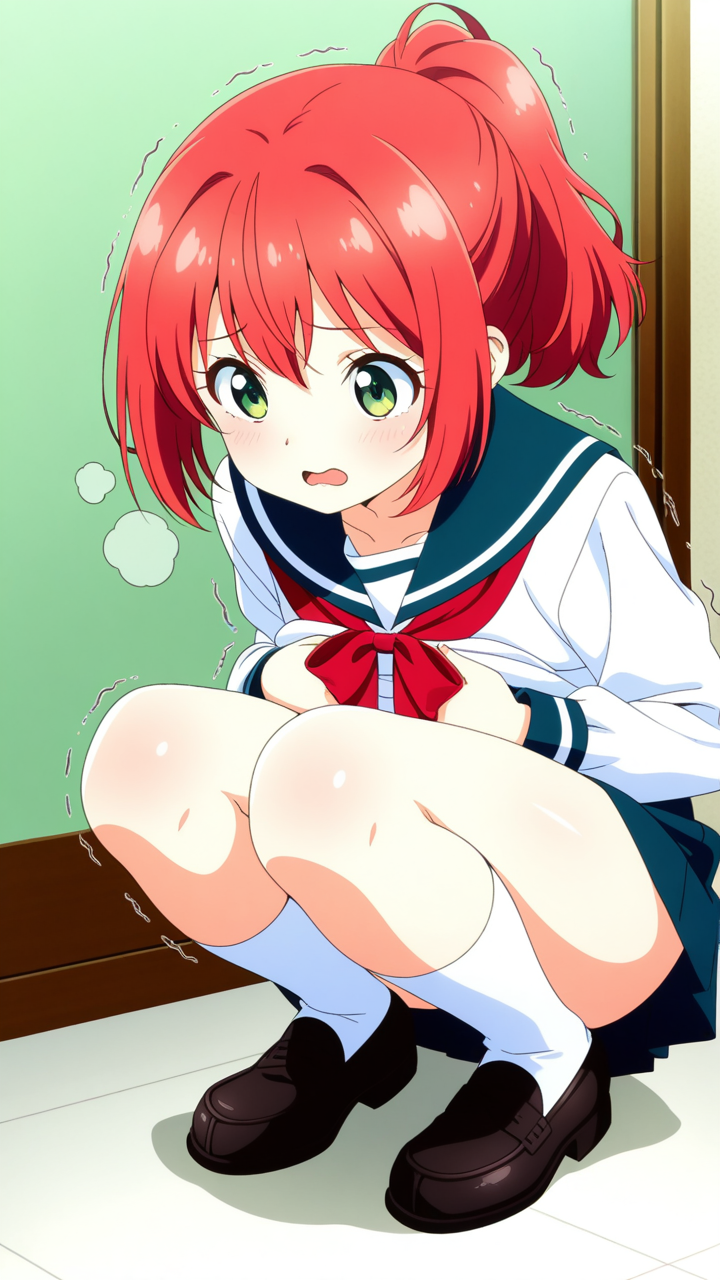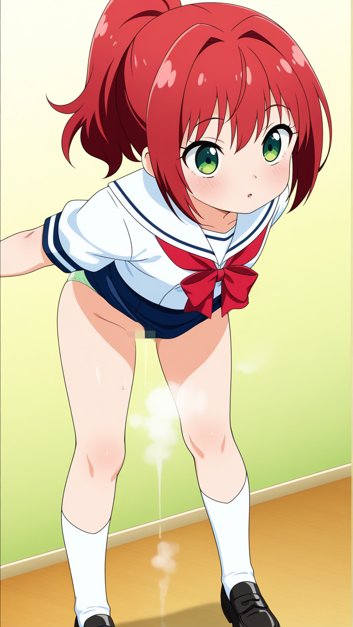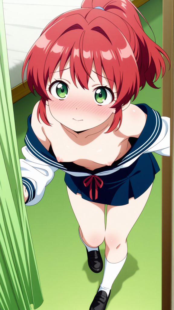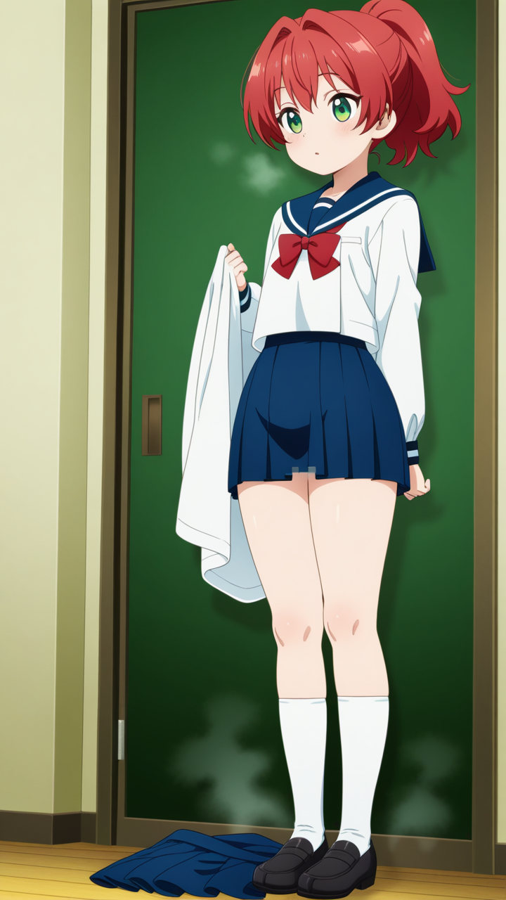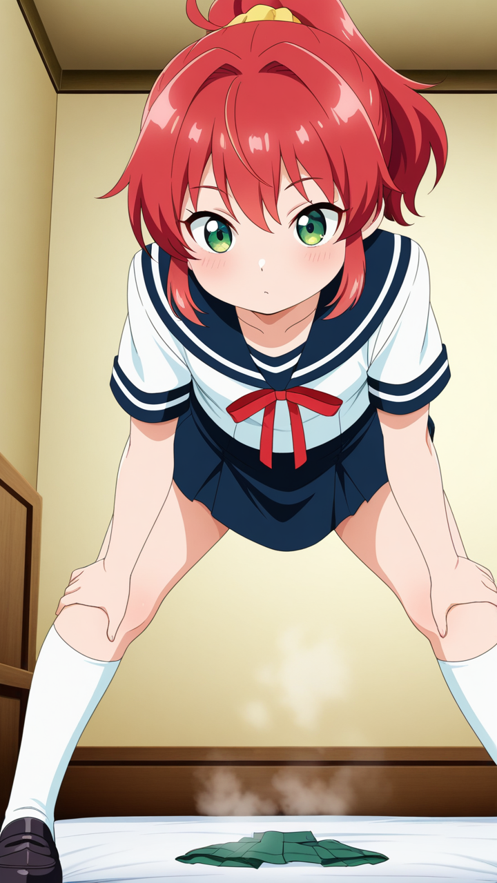 美少女,おっぱい,おしり,M字開脚,食い込み,乳首,パンツ,くぱぁ,,赤髪のポニーテール,翠色の瞳、垂れ目気味のハーフ目,小柄でむっちりした体型,セーラー服、赤いリボン、白いニーソックス、黒いローファー,甘えんぼで依存的、可愛らしい仕草が多い