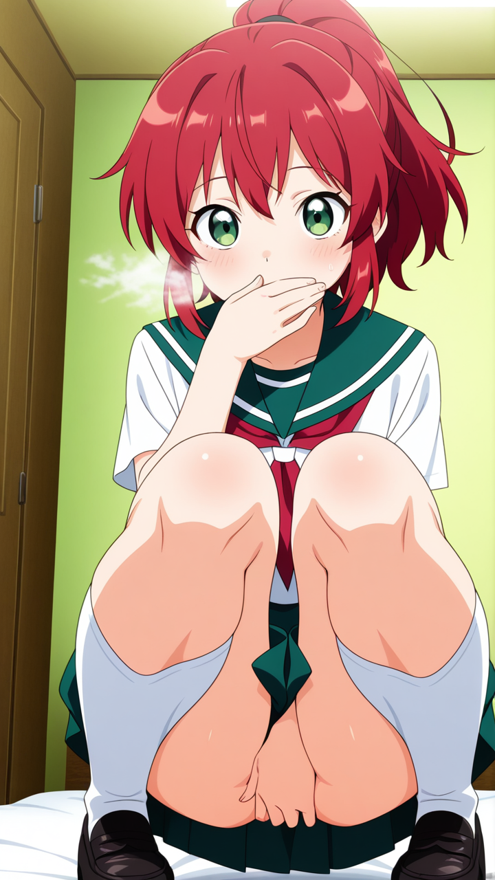 red hair, ponytail,emerald green eyes, gentle downturned eyes, half-lidded,petite, soft and curvy body,sailor uniform, red ribbon, white knee socks, black loafers,clingy and dependent, adorable mannerisms, needy, sweet demeanor