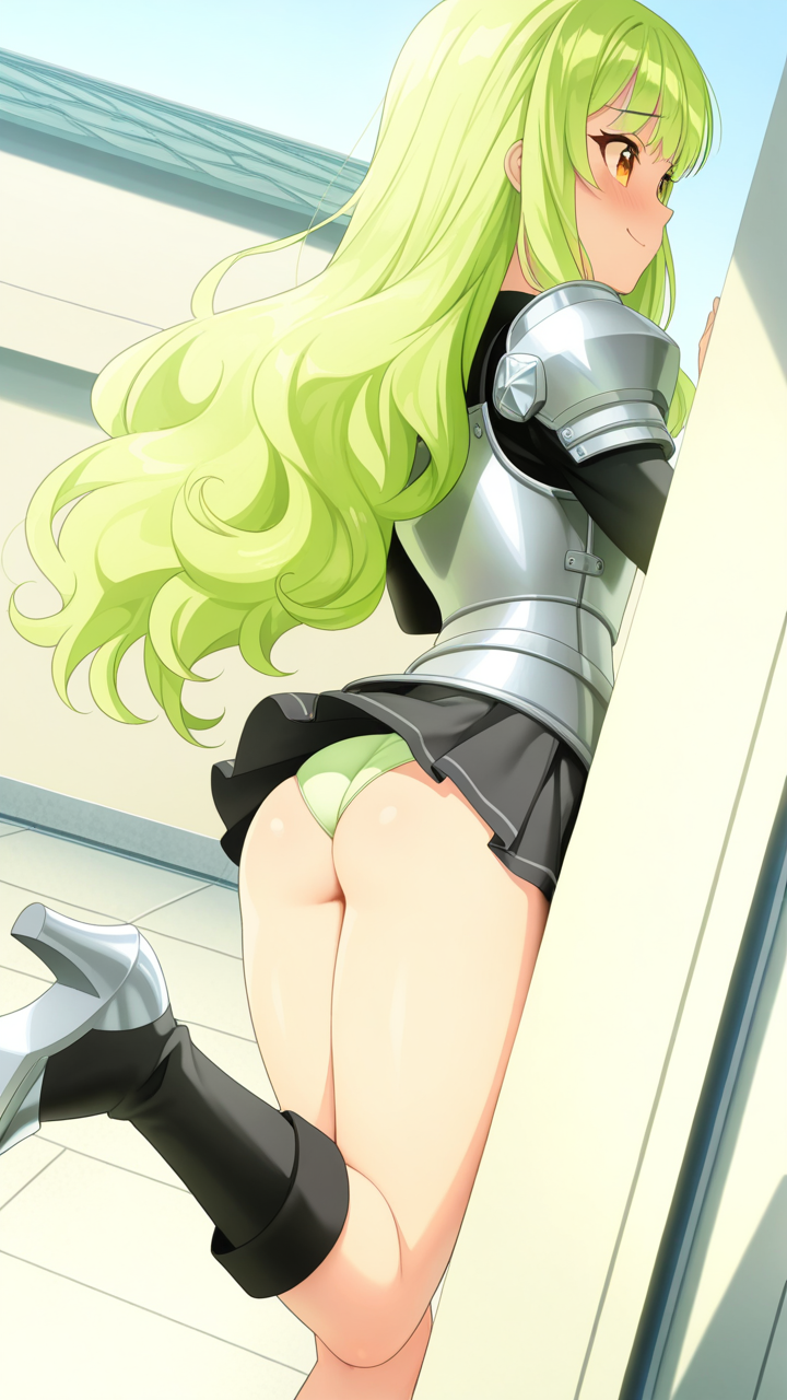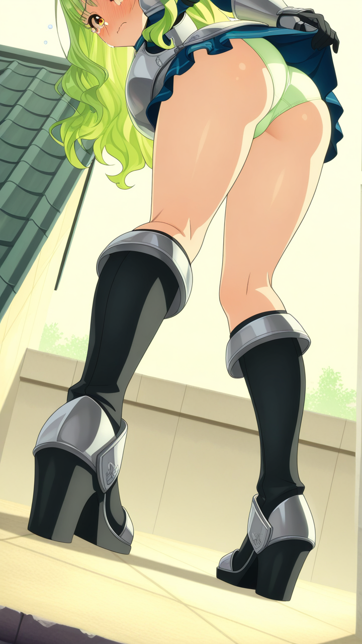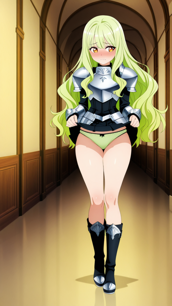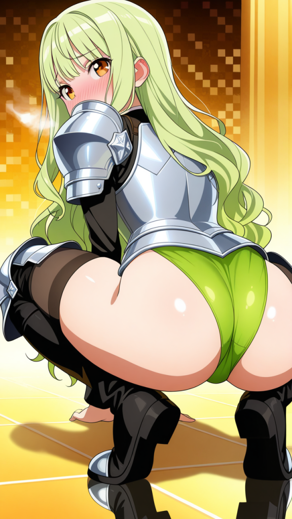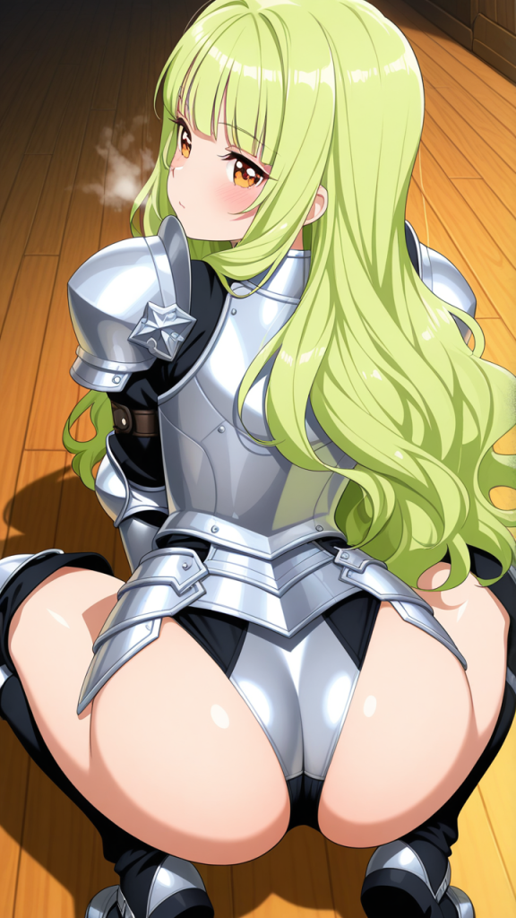 美少女,おっぱい,おしり,M字開脚,食い込み,乳首,パンツ,くぱぁ,バック,後背位,,ライム色のウェーブロング,琥珀色の大きなぱっちり目,小柄でむっちりした体型,銀色の騎士鎧、胸部に装飾が施された甲冑、黒いブーツ,クール・無口で落ち着いた雰囲気