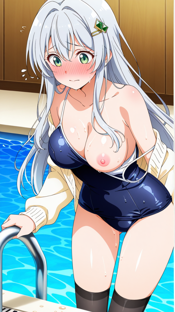 美少女,おっぱい,おしり,スク水,スクール水着,水着,,金からピンクへのグラデーションセミロング,翠色の瞳、ハーフっぽい二重,背が高くスレンダー,白ニットセーター、黒ニーソックス、シルバーヘアピン,恥ずかしがり屋で内気