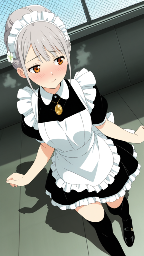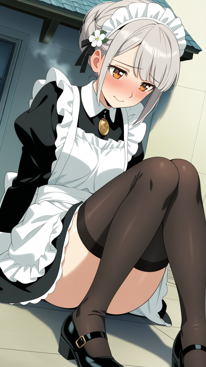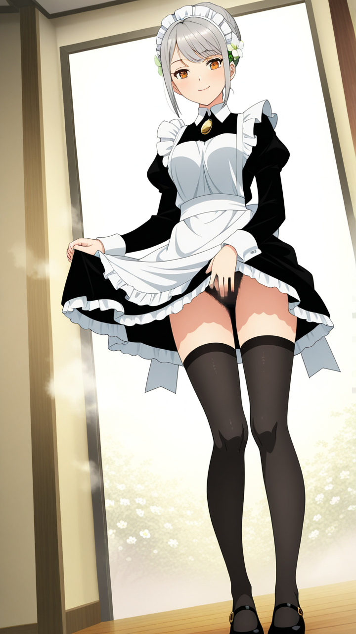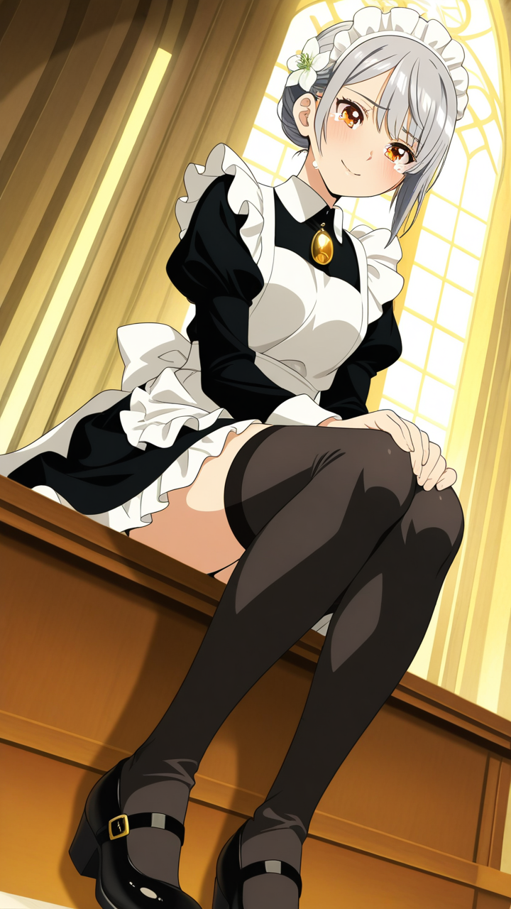 gray hair, updo hairstyle, soft fluffy ends,amber eyes, droopy half-lidded gaze,tall slender figure,classic maid dress in black and white, white apron, subtle gold locket pendant at chest, white eucalyptus flower ornament in hair, black thigh-high socks, black Mary Jane shoes,gentle and soothing, soft smile with enveloping kindness, calm and comforting presence