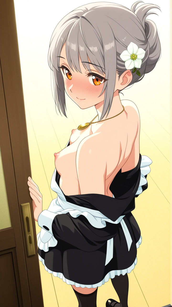 美少女,おっぱい,おしり,M字開脚,食い込み,乳首,パンツ,くぱぁ,,グレー髪のアップスタイル、毛先にふんわりとした柔らかさ,琥珀色の瞳、垂れ目気味のハーフ目,背が高くスレンダー,黒と白を基調としたクラシックメイド服、白いエプロン、胸元に淡いゴールドのロケットペンダント、髪に白いユーカリの花飾り、黒いニーハイソックス、黒いマリアシューズ,おっとり癒し系、柔らかい笑顔で包み込むような優しさ