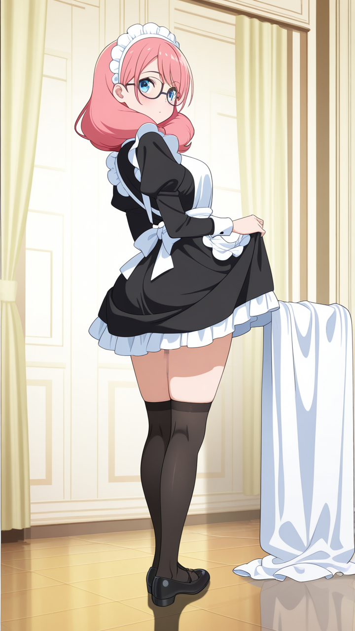cherry blossom pink upstyle hair with soft, fluffy ends,light blue eyes, slightly droopy half-lidded gaze,tall and slender build,classic black and white maid outfit, white apron, glasses, black thigh-high socks, black mary jane shoes,cool, taciturn, elegant and composed demeanor