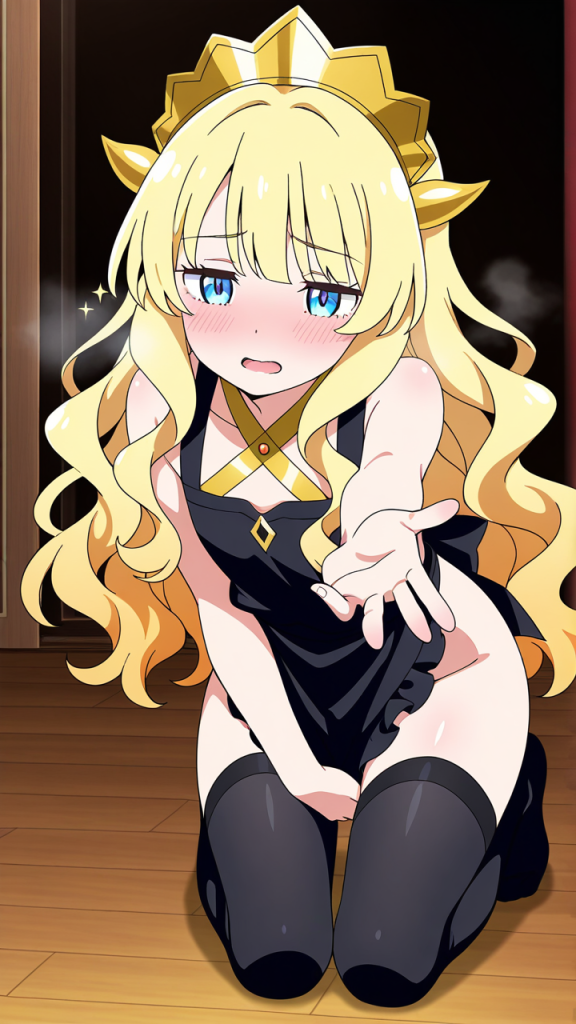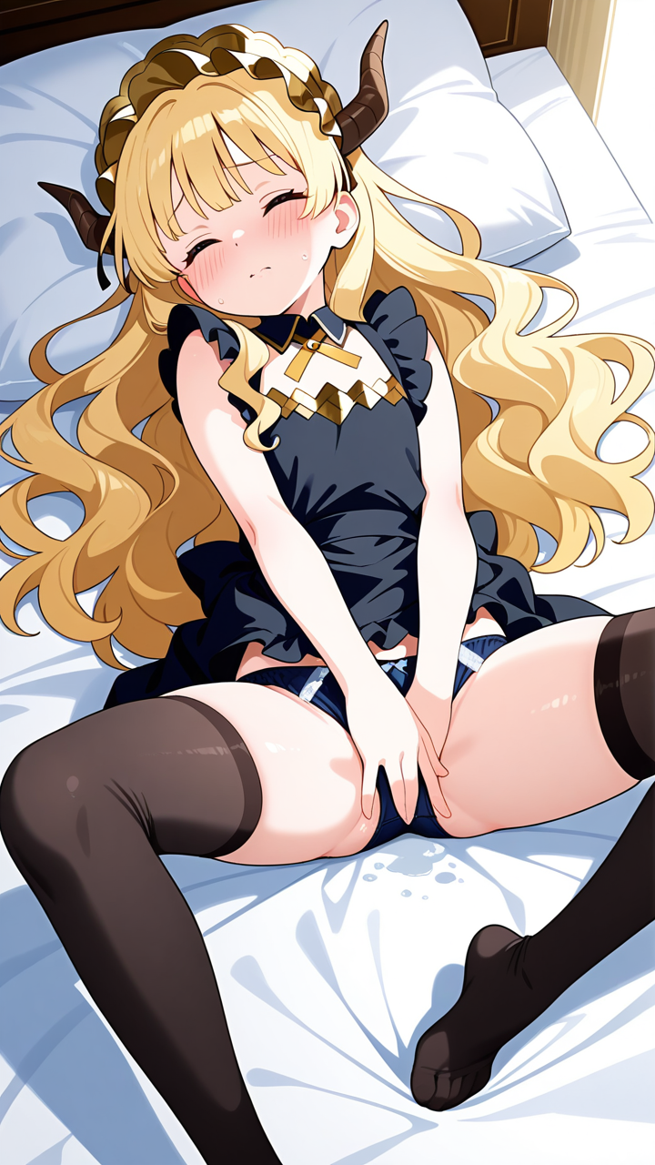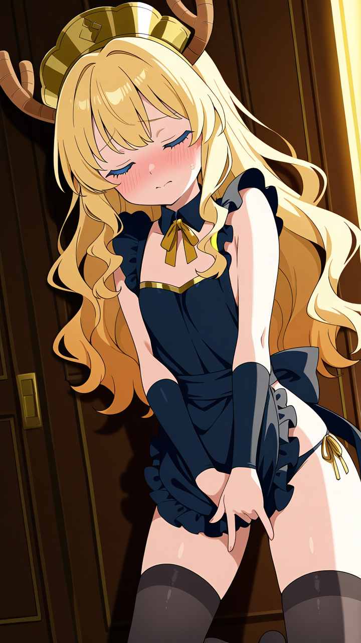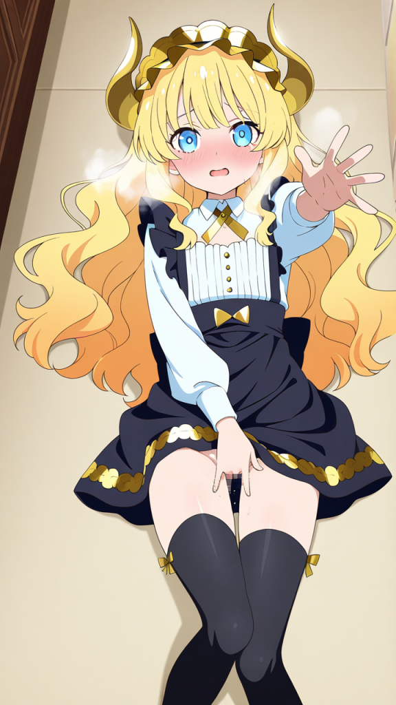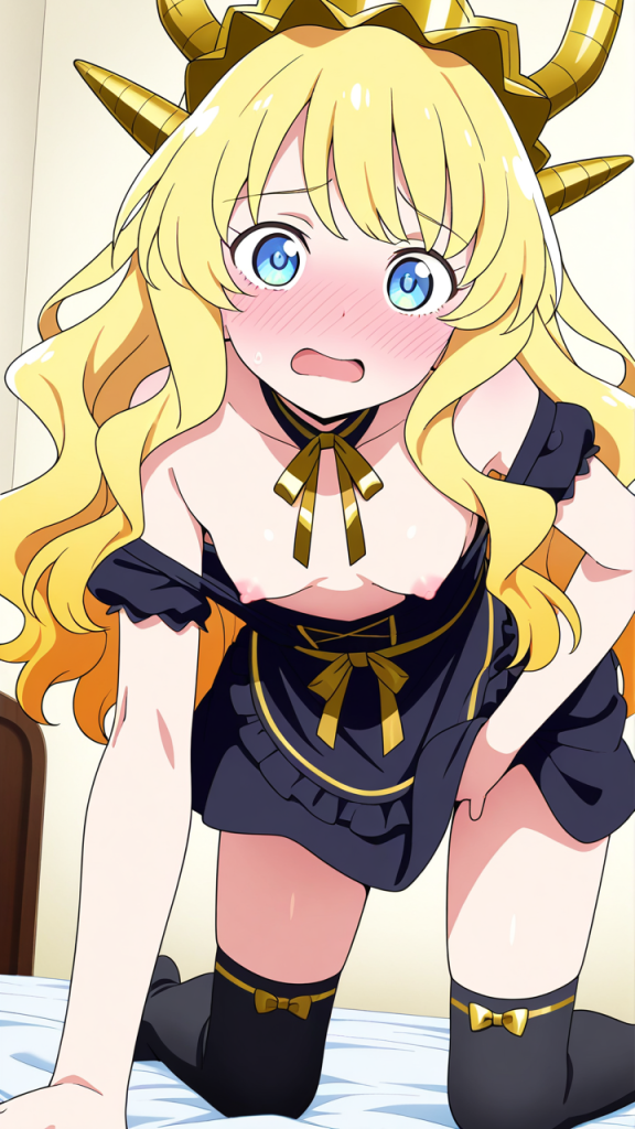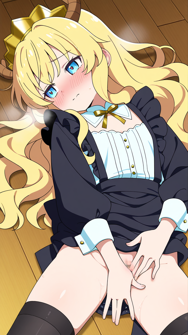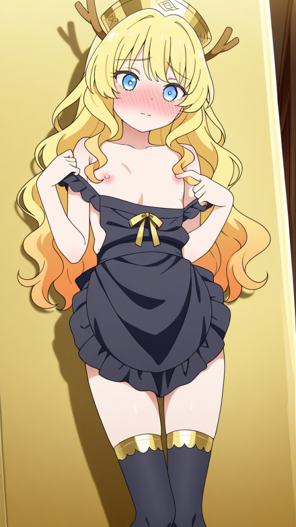 美少女,おっぱい,おしり,M字開脚,乳首,パンツ,くぱぁ,オナニー,自慰,指,マスターベーション,,金髪のウェーブロング,水色の瞳、細めのクールな目,貧乳・長身,黒と金を基調としたドラゴンメイド服、胸元に金のリボン、黒いエプロン、黒いニーハイソックス、金色のヘッドドレス,天然ドジっ子、ぶっきらぼう
