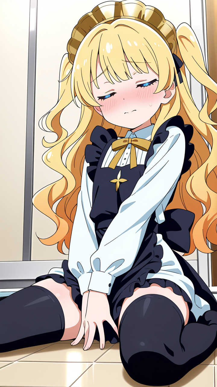 blonde long wavy hair,light blue eyes, narrow cool gaze,petite chest, tall slender figure,dragon maid outfit with black and gold, gold ribbon at chest, black apron, black thigh-high socks, gold headdress,airheaded clumsy girl, blunt and straightforward