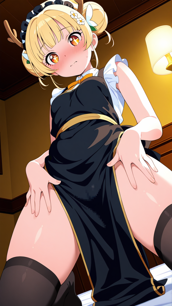 美少女,おっぱい,おしり,M字開脚,乳首,パンツ,くぱぁ,開脚,,金髪のお団子ヘア,琥珀色の丸くてキラキラした瞳,小柄でむっちりした体型,黒と金を基調としたドラゴンメイド服、黒いエプロン、花飾りのヘッドアクセサリー、黒いニーハイソックス,気の強いボーイッシュで元気いっぱい
