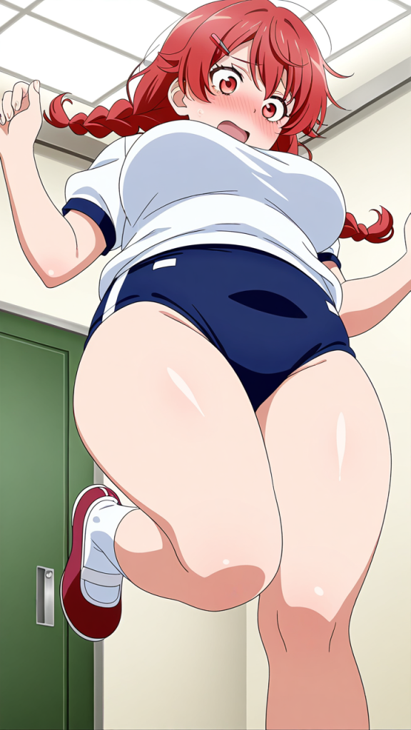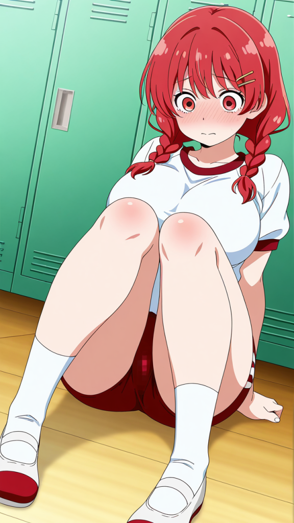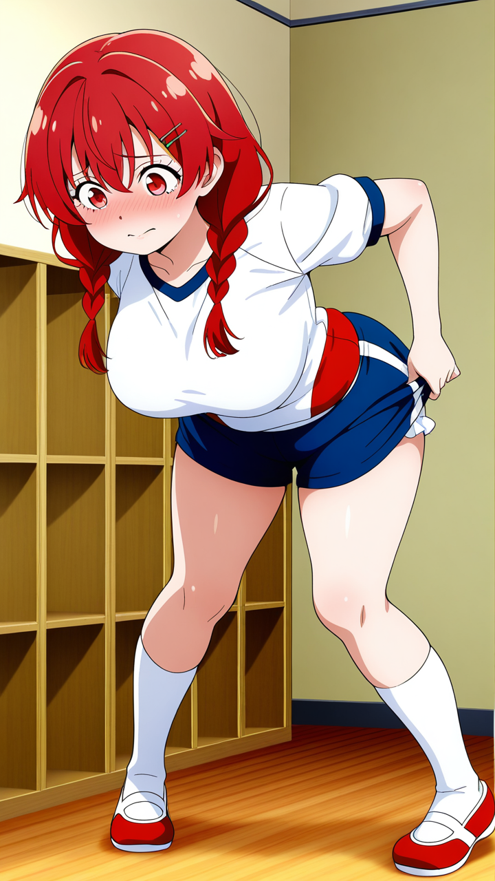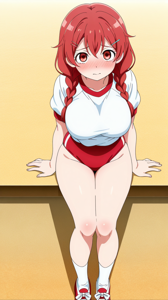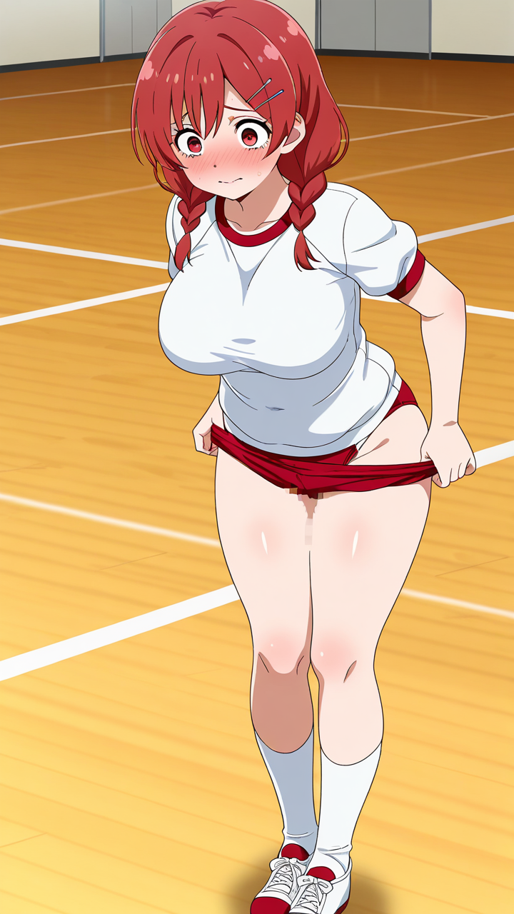 美少女,おっぱい,おしり,体操服,ブルマ,体育,,赤髪のツインおさげ、毛先に少しくせがある,深紅の瞳、つり目,巨乳、むっちりとした体型,赤と白のツートーン体操着、赤いヘアピン、白いニーソックス、赤いシューズ,元気系、活発で明るく積極的