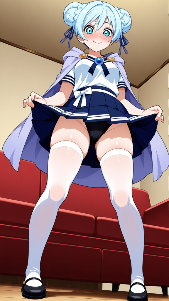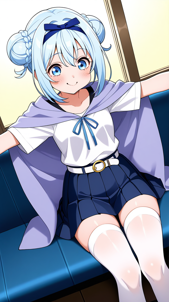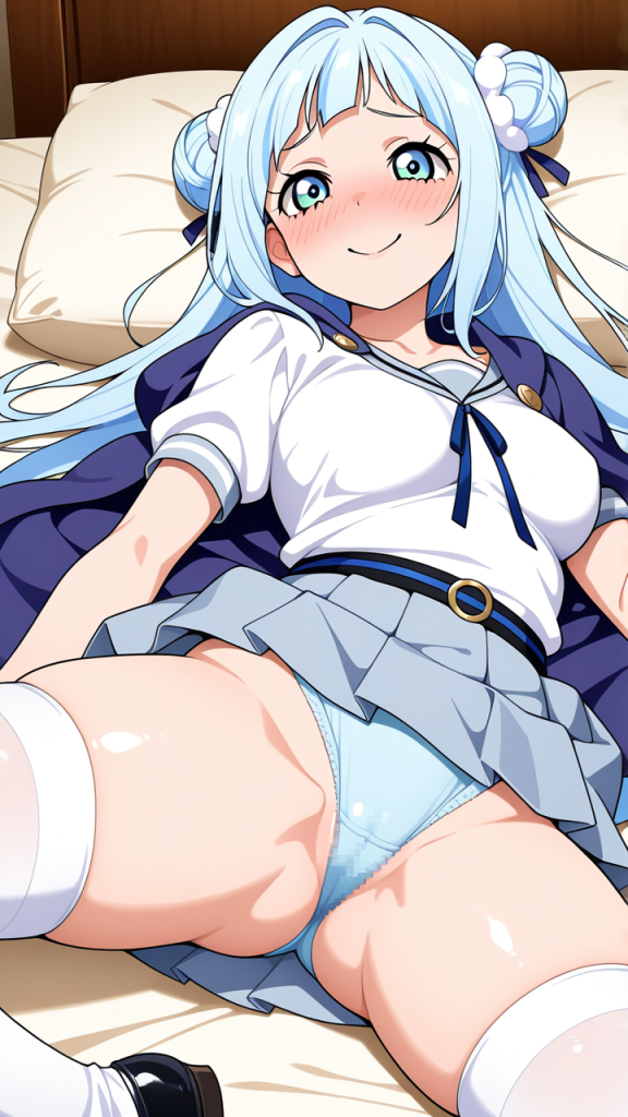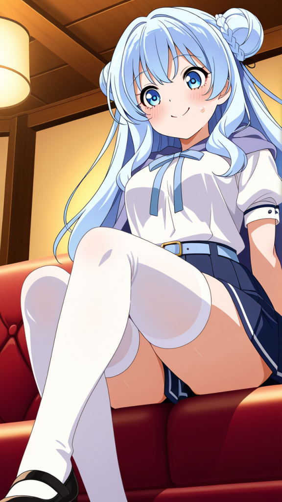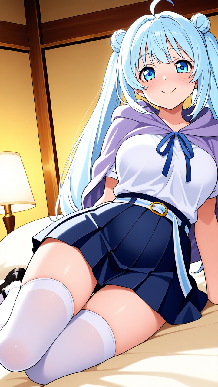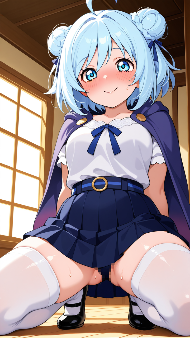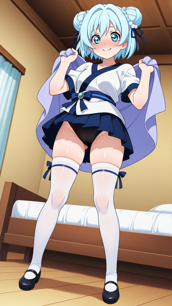 美少女,おっぱい,おしり,ニーソ,絶対領域,太もも,,青髪のお団子ヘア、毛先にふんわりとした柔らかさ,青い瞳、ハーフっぽい二重,普通体型・少しむっちり,淡い青の帯を帯状に巻いた白い半袖シャツ、紺色のプリーツスカート、薄い青紫のショールを肩に羽織った和洋折衷スタイル、胸元に淡い青のリボン、白いソックス、黒いバレエシューズ,天然ドジっ子、うっかり屋だが心優しく、笑顔が絶えない