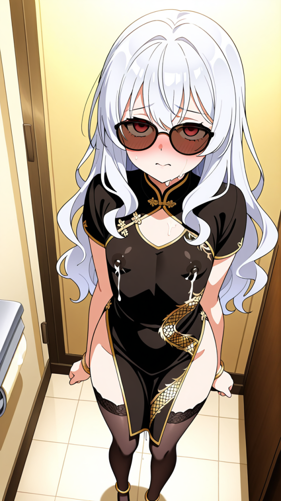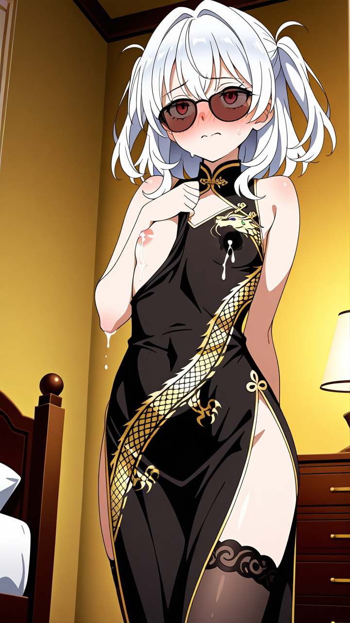 美少女,おっぱい,乳首,授乳,母乳,ミルク,巨乳,,白髪の内巻きセミロング,赤い瞳のつり目,貧乳・長身,黒地に金の龍紋が入った豪華なチャイナドレス、黒いストッキング、金色のアンクレット、サングラス,高飛車で気高いお嬢様、上品だが気まぐれで周囲を振り回す