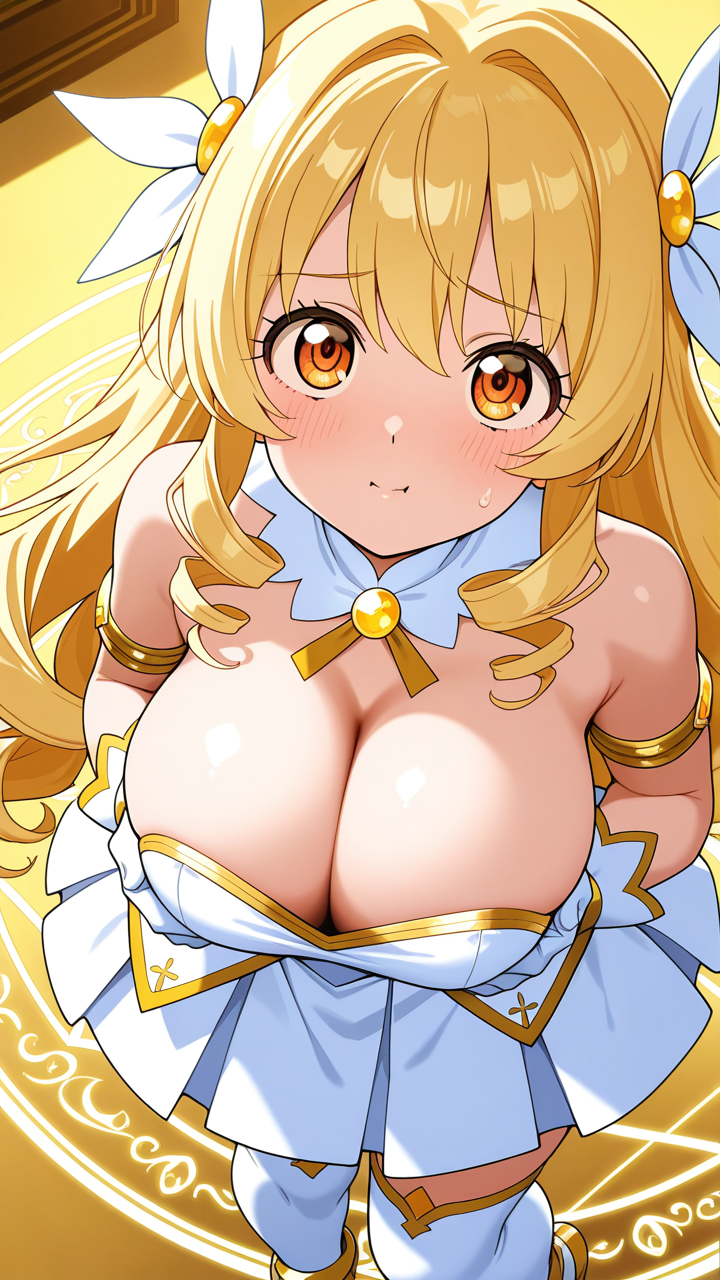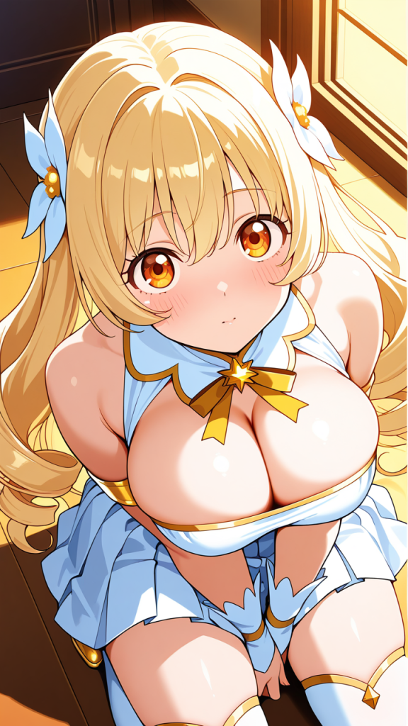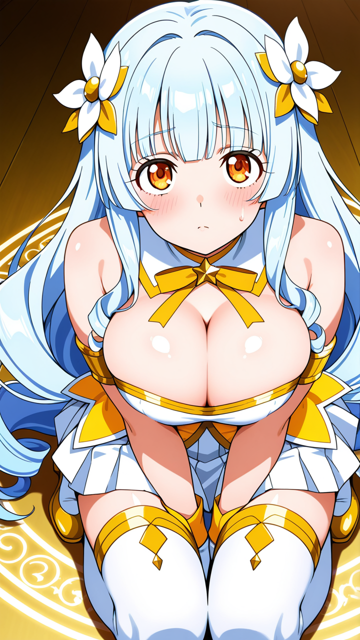 美少女,おっぱい,乳首,パイズリ,巨乳,乳挟み,,白髪のセミロング、毛先にふんわりした内巻き,琥珀色の瞳、つり目,スポーティー・筋肉質,白と金を基調とした魔法少女衣装、胸元に金色のリボン、スカートに白のプリーツ、白いニーハイソックス、金色のマジカルシューズ、髪に白い花飾り、腕に金色の魔法陣が浮かぶアームバンド,天然ドジっ子だが芯の強さがある