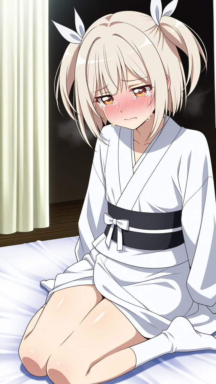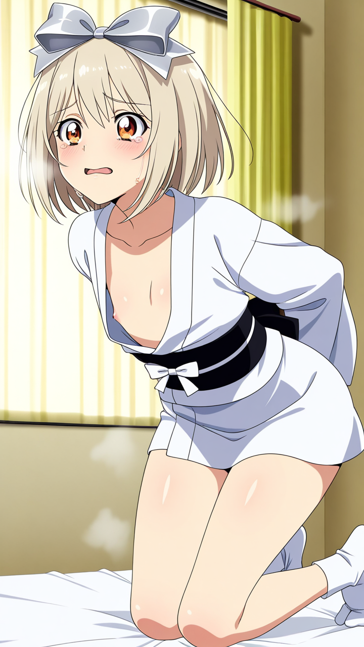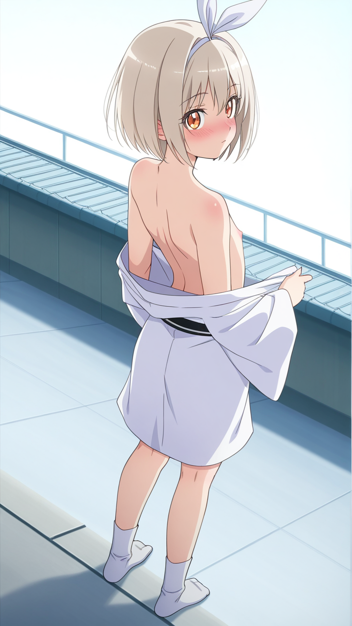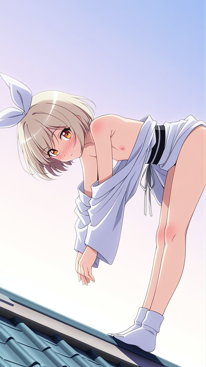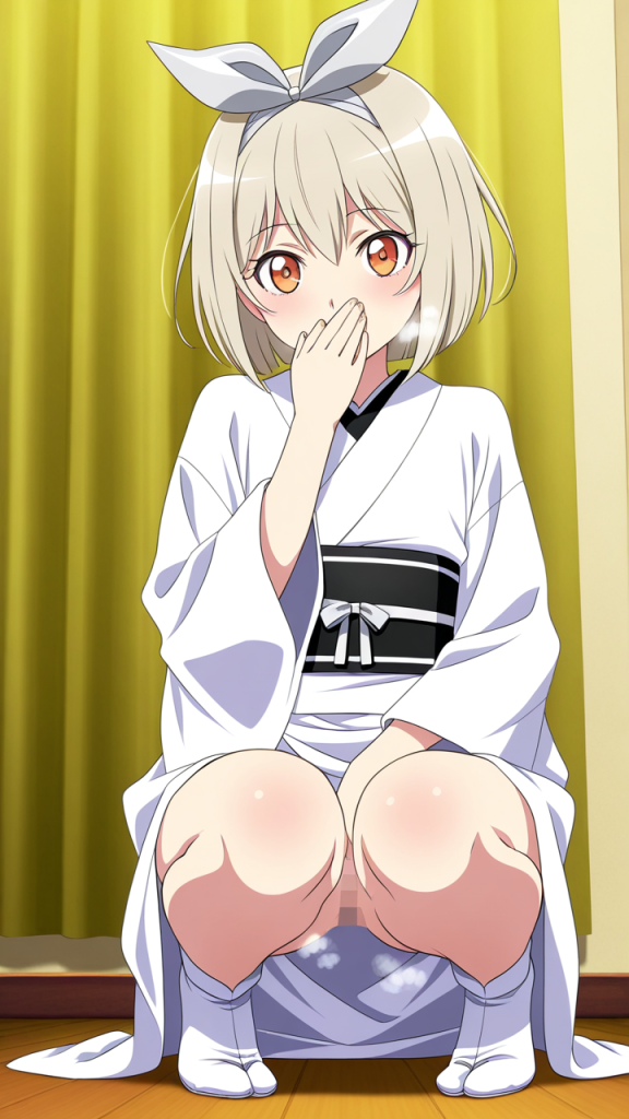 美少女,おっぱい,おしり,M字開脚,食い込み,乳首,パンツ,くぱぁ,,プラチナ髪のショートカット、毛先に少し動きのある質感,琥珀色の瞳、ハーフっぽい二重,貧乳・長身,白い麻地の着物に深紅の半幅帯、襟元に銀色のリボン、足袋は白、白い足袋、髪に小ぶりな琥珀色のリボンバレッタ,純粋無垢で優しく、どこか儚げ
