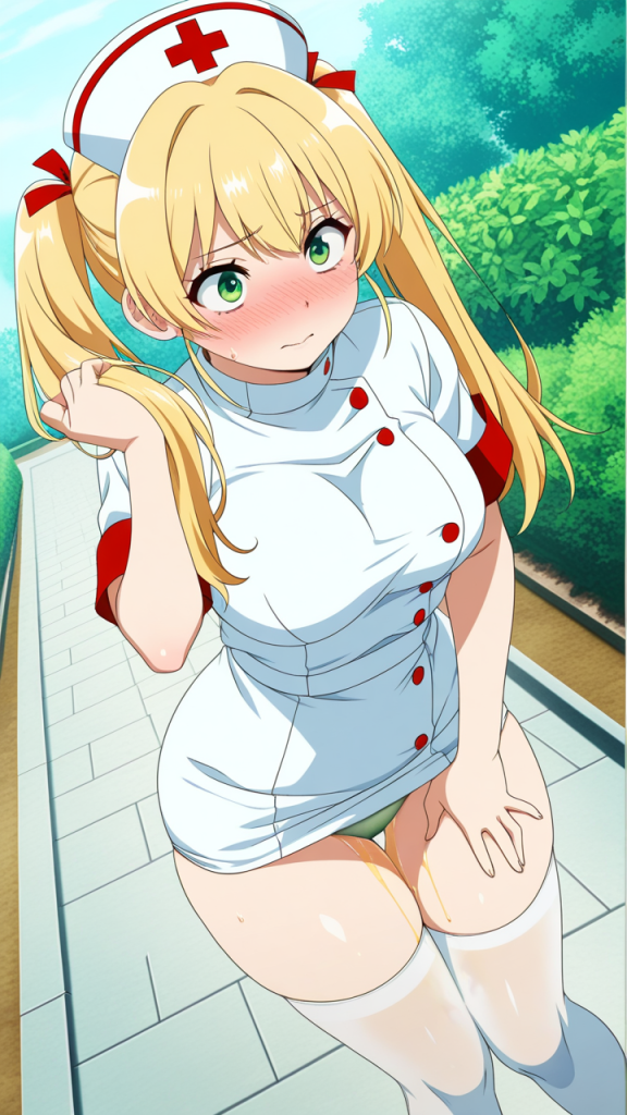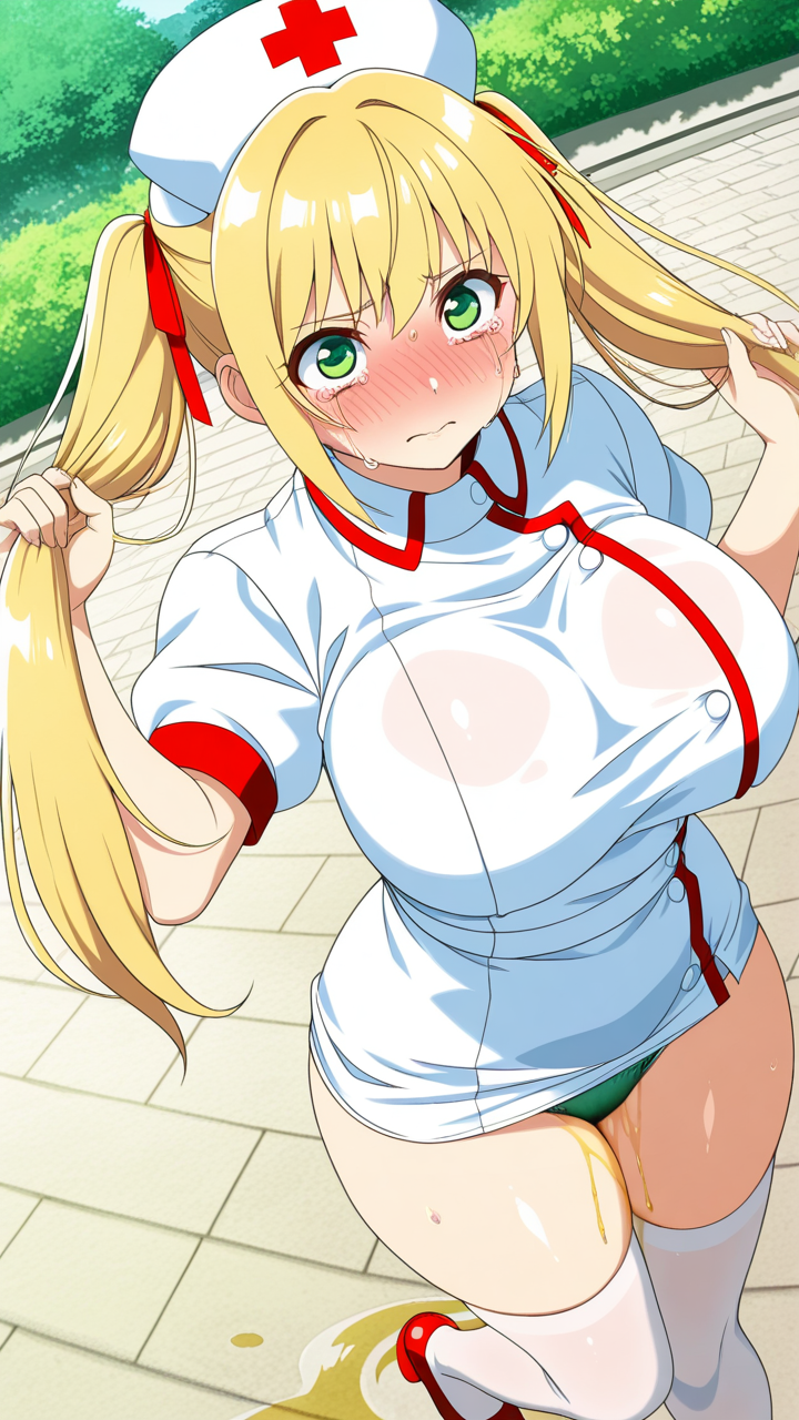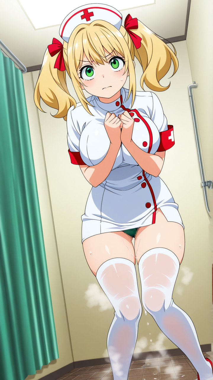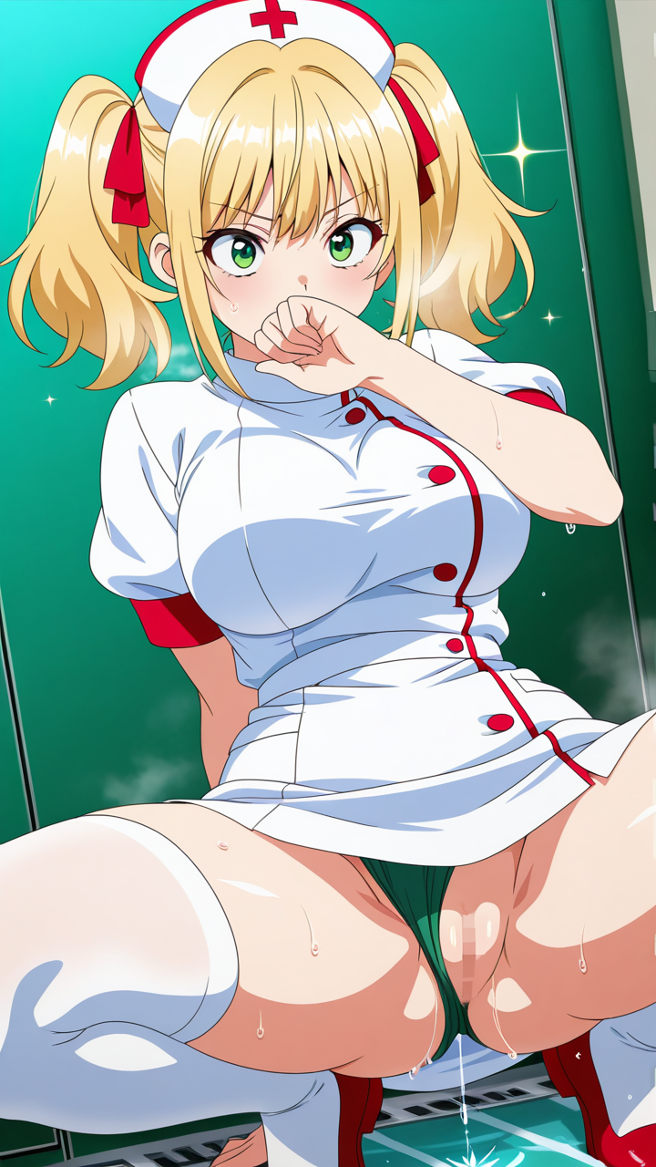 美少女,おっぱい,おしり,M字開脚,食い込み,乳首,パンツ,くぱぁ,おしっこ,お漏らし,放尿,,金髪のツインテール、毛先に軽くウェーブ,翠色の瞳、つり目,グラマラス,白いナース服、胸元に赤いリボン、白いニーハイソックス、赤いナースシューズ,気の強いボーイッシュで、芯がしっかりしている