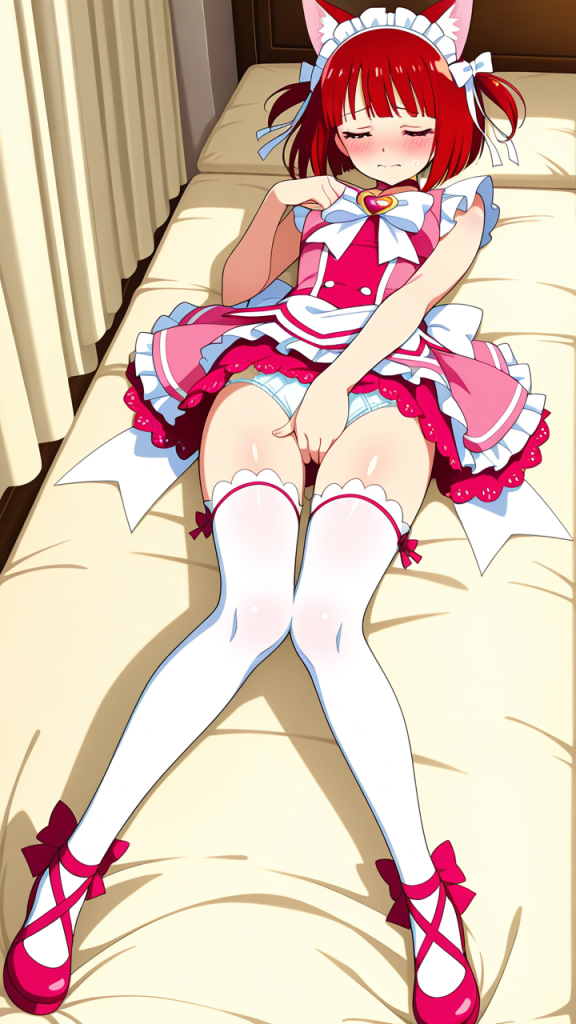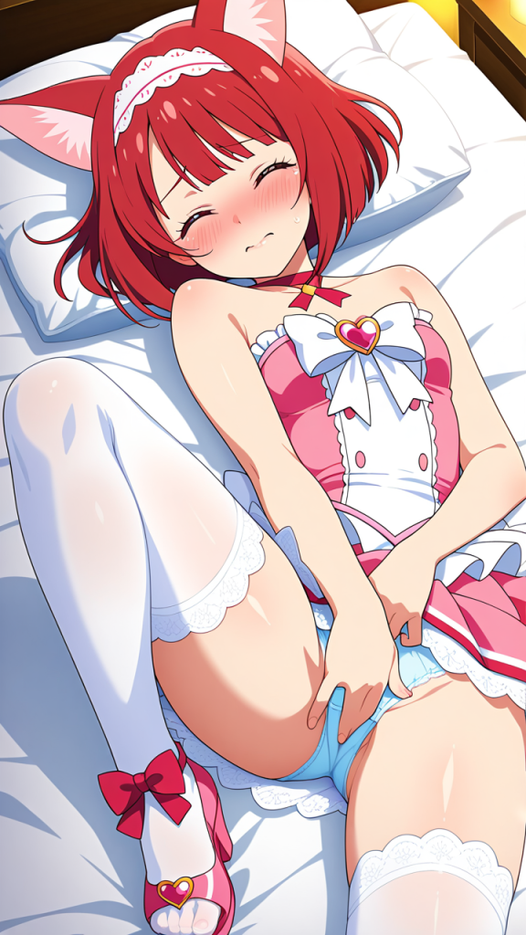 美少女,おっぱい,おしり,M字開脚,乳首,パンツ,くぱぁ,オナニー,自慰,指,マスターベーション,,赤髪の外ハネボブ,赤い瞳、垂れ目気味のハーフ目,細身・長身モデル体型,ピンク基調の魔法少女衣装、胸元に白いリボン、スカートにレース装飾、狐耳ヘッドバンド、白いニーハイソックス、ピンク色のマジカルシューズ,恥ずかしがり屋で照れやすく、儚げな雰囲気