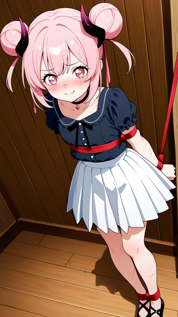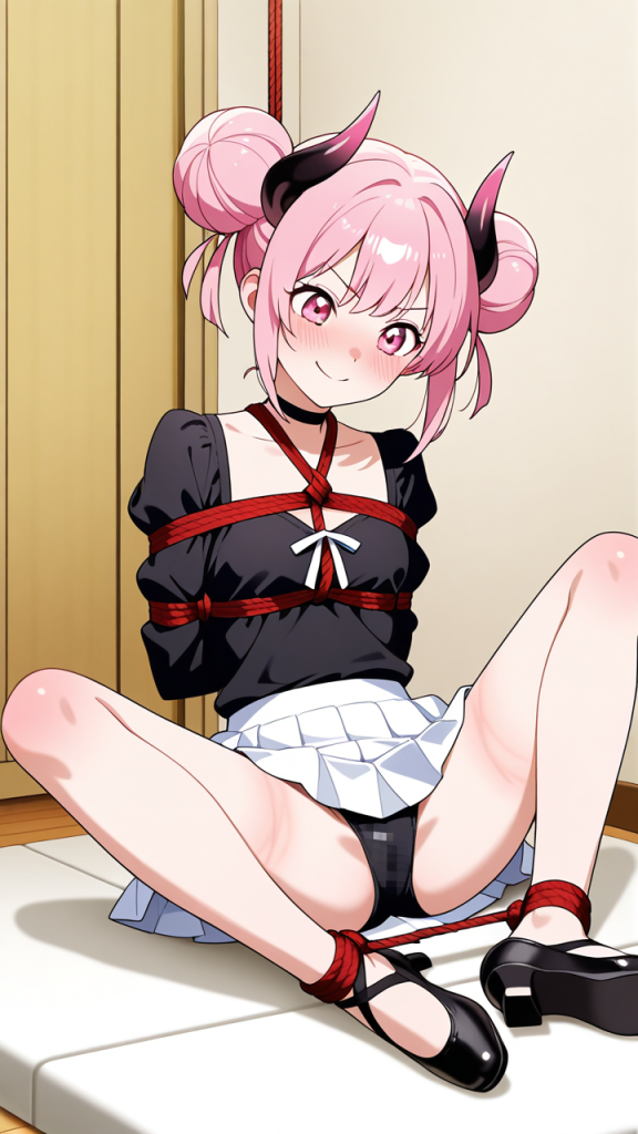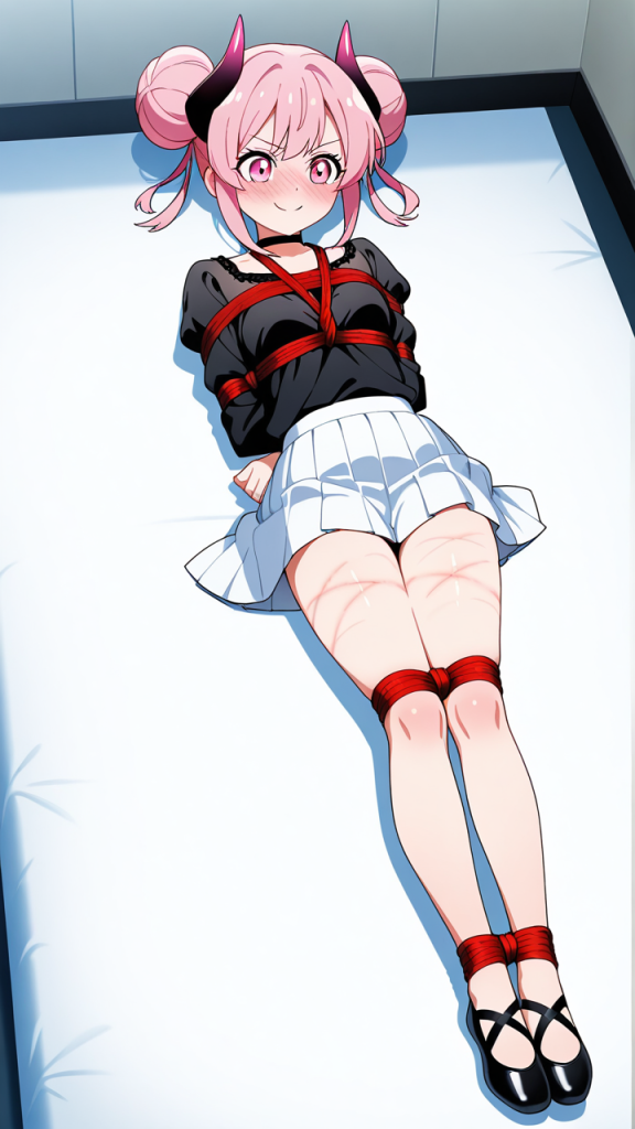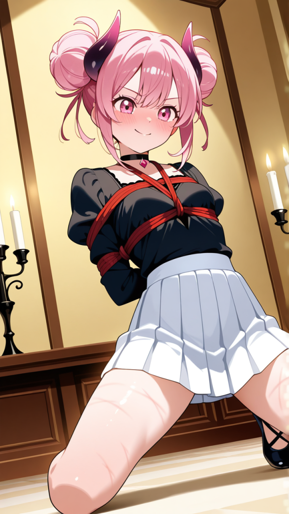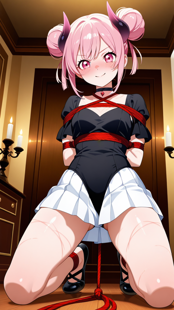 美少女,おっぱい,おしり,乳首,縛り,ロープ,拘束,SM,ボンデージ,,桜色のお団子ヘア、毛先にふんわりとした柔らかさ,ピンクの瞳、丸くてキラキラした目,細身・長身モデル体型,黒いシースルーブラウス、白いプリーツスカート、黒いチョーカー、悪魔の角、黒いバレエシューズ,勝ち気で負けず嫌い、自信に満ちた笑顔