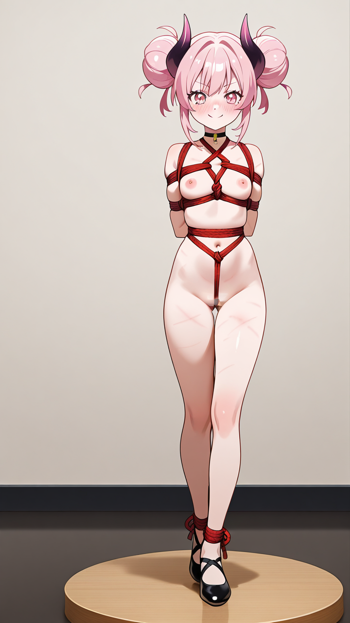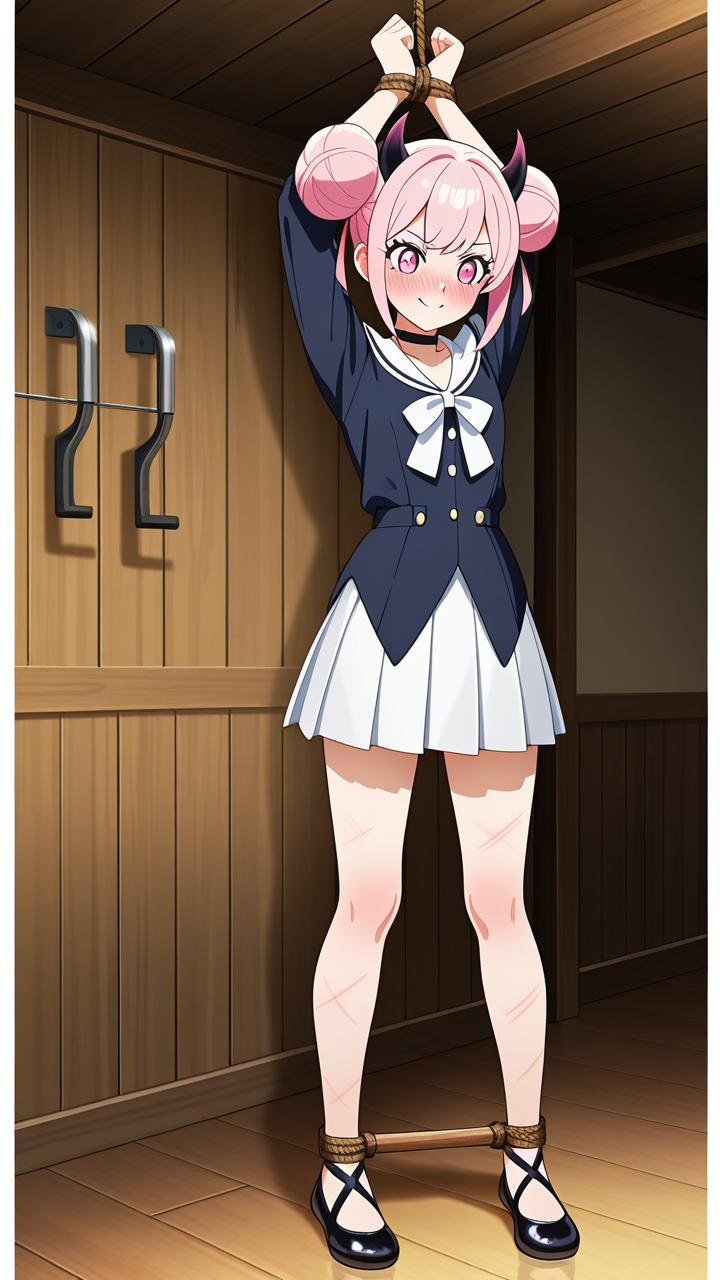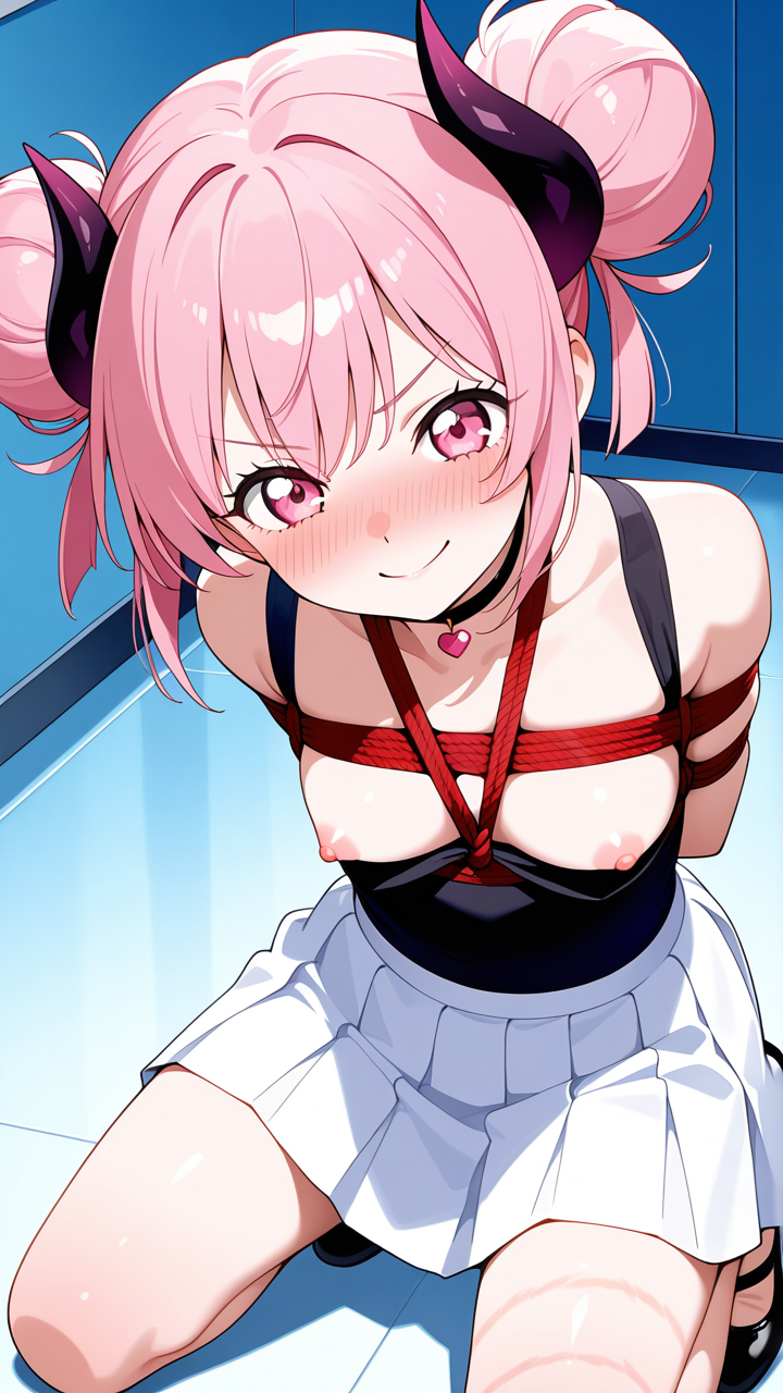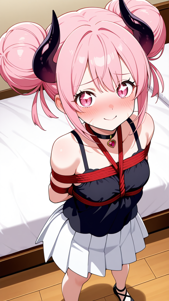 美少女,おっぱい,おしり,乳首,縛り,ロープ,拘束,SM,ボンデージ,,桜色のお団子ヘア、毛先にふんわりとした柔らかさ,ピンクの瞳、丸くてキラキラした目,細身・長身モデル体型,黒いシースルーブラウス、白いプリーツスカート、黒いチョーカー、悪魔の角、黒いバレエシューズ,勝ち気で負けず嫌い、自信に満ちた笑顔