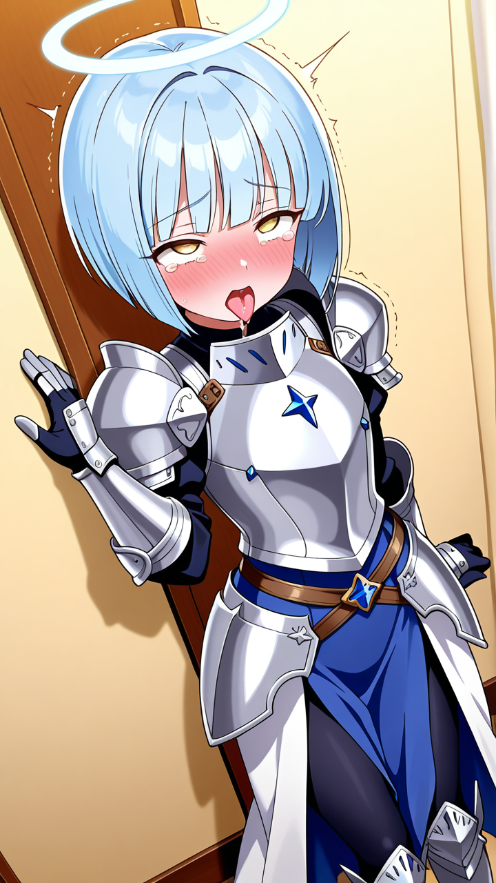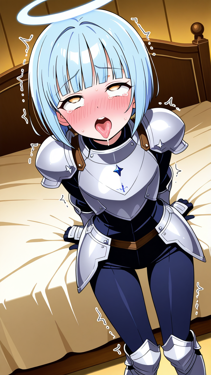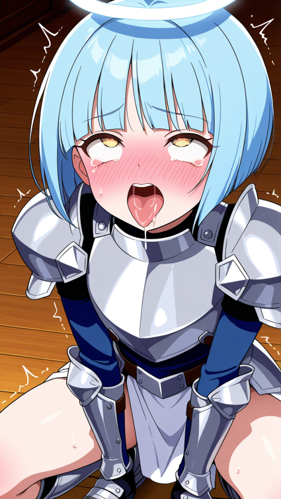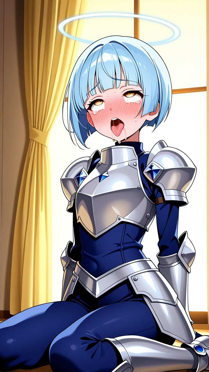 美少女,おっぱい,おしり,乳首,アヘ顔,白目,舌出し,よだれ,,青髪の外ハネボブ,金の瞳、細めのクールな目,貧乳・小柄,銀色の騎士鎧、天使の輪,恥ずかしがり屋、照れやすい