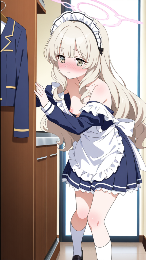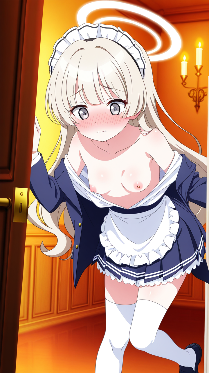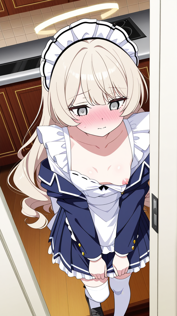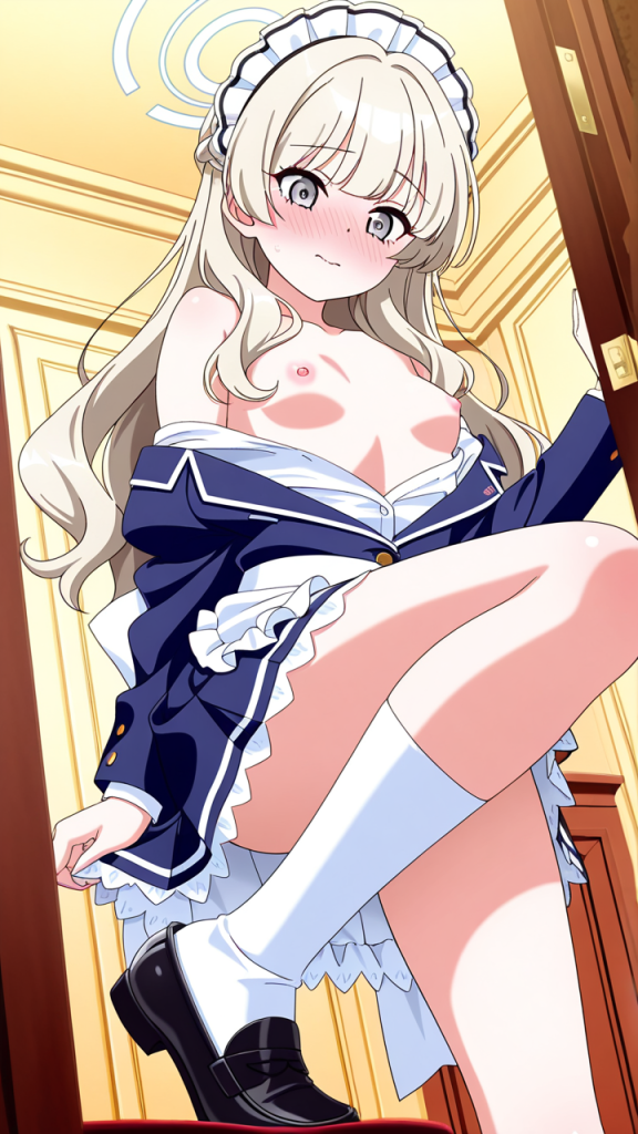 美少女,おっぱい,乳首,メイド,メイド服,コスプレ,,プラチナブロンドの内巻きセミロング,銀色の細めのクールな瞳,貧乳・小柄,紺色のブレザー学生服、白いシャツ、紺色のプリーツスカート、白いニーハイソックス、黒いローファー、天使の輪,甘えんぼで可愛らしい