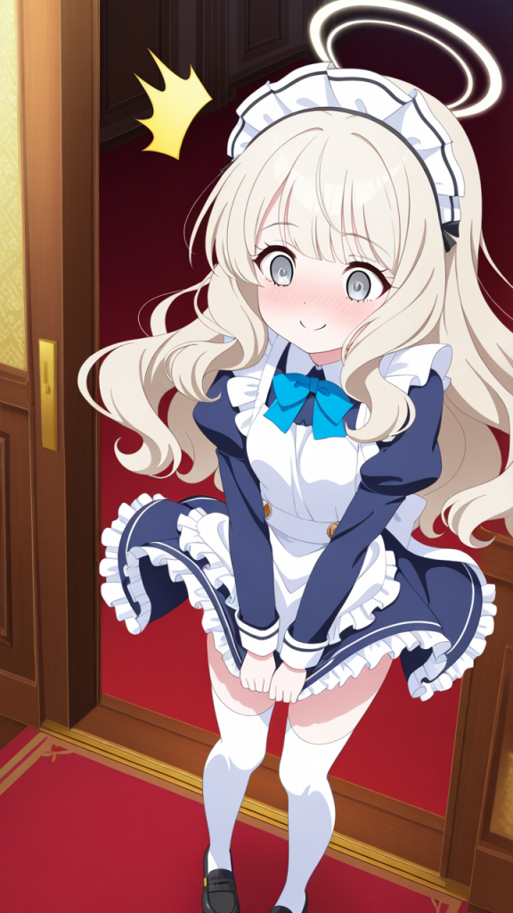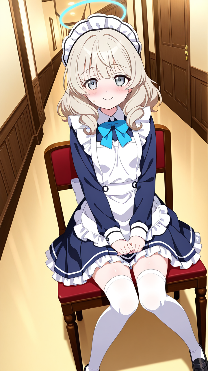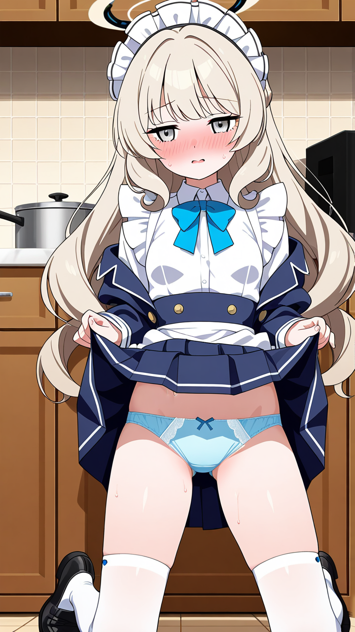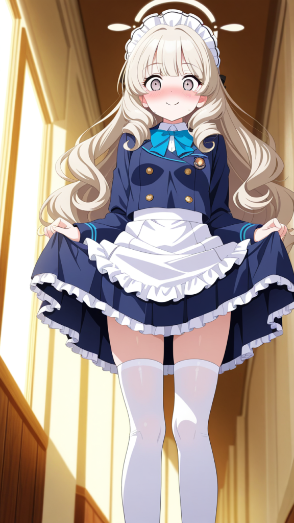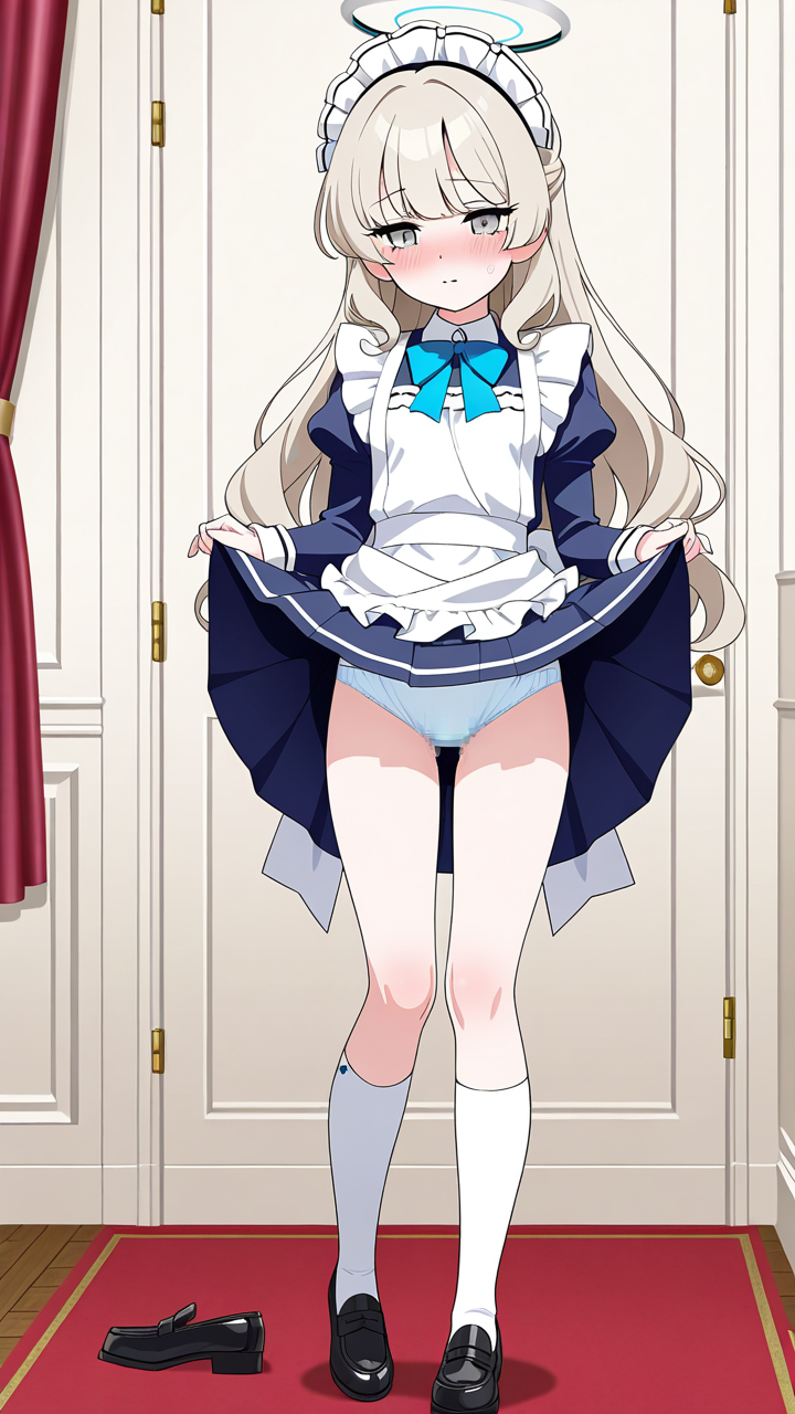 美少女,おっぱい,乳首,メイド,メイド服,コスプレ,,プラチナブロンドの内巻きセミロング,銀色の細めのクールな瞳,貧乳・小柄,紺色のブレザー学生服、白いシャツ、紺色のプリーツスカート、白いニーハイソックス、黒いローファー、天使の輪,甘えんぼで可愛らしい