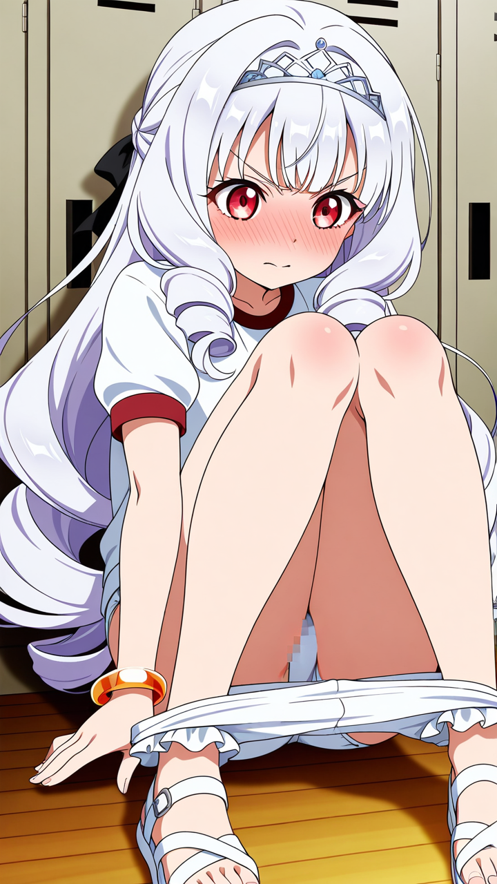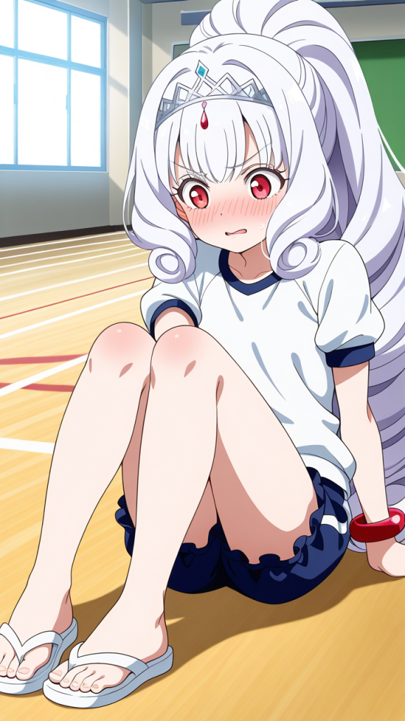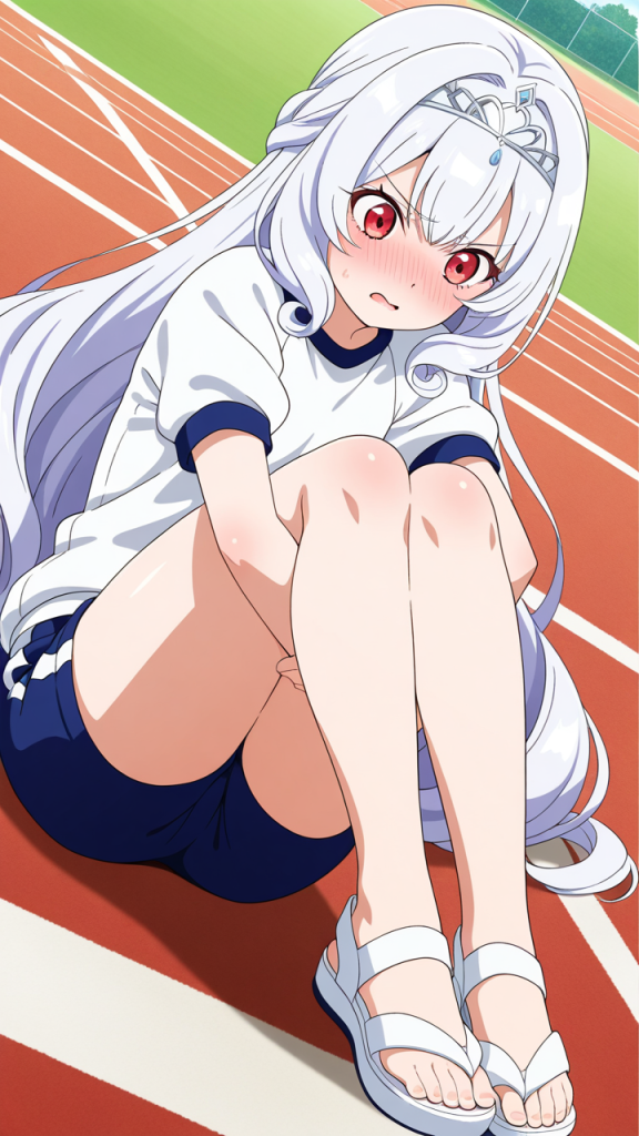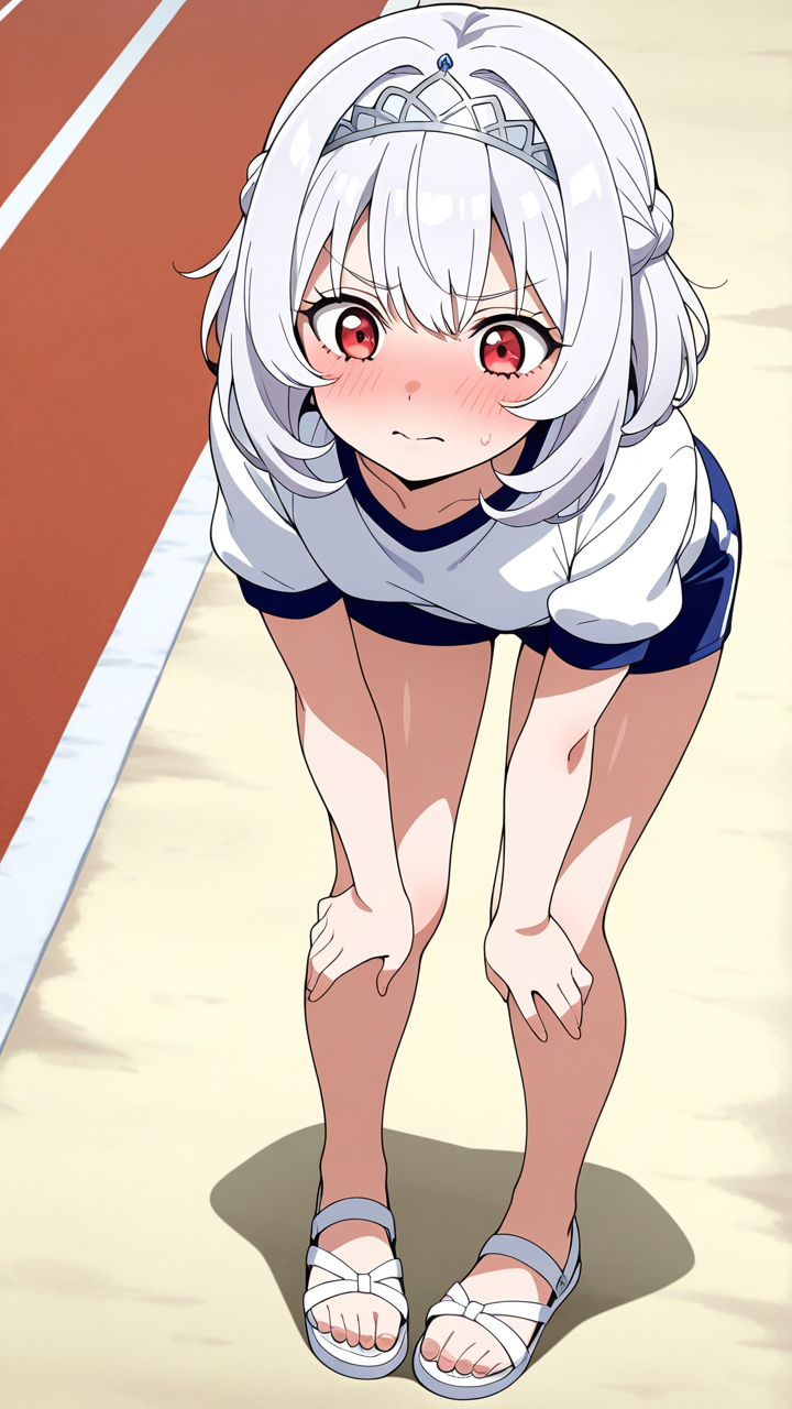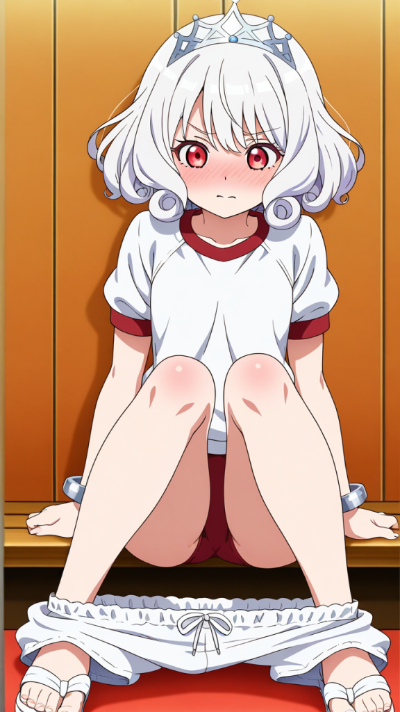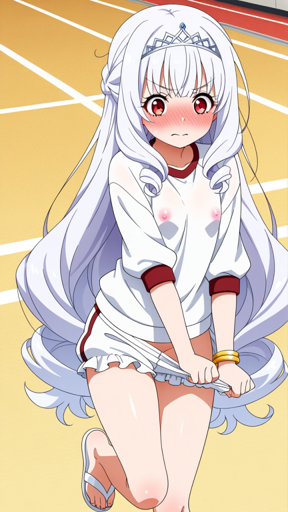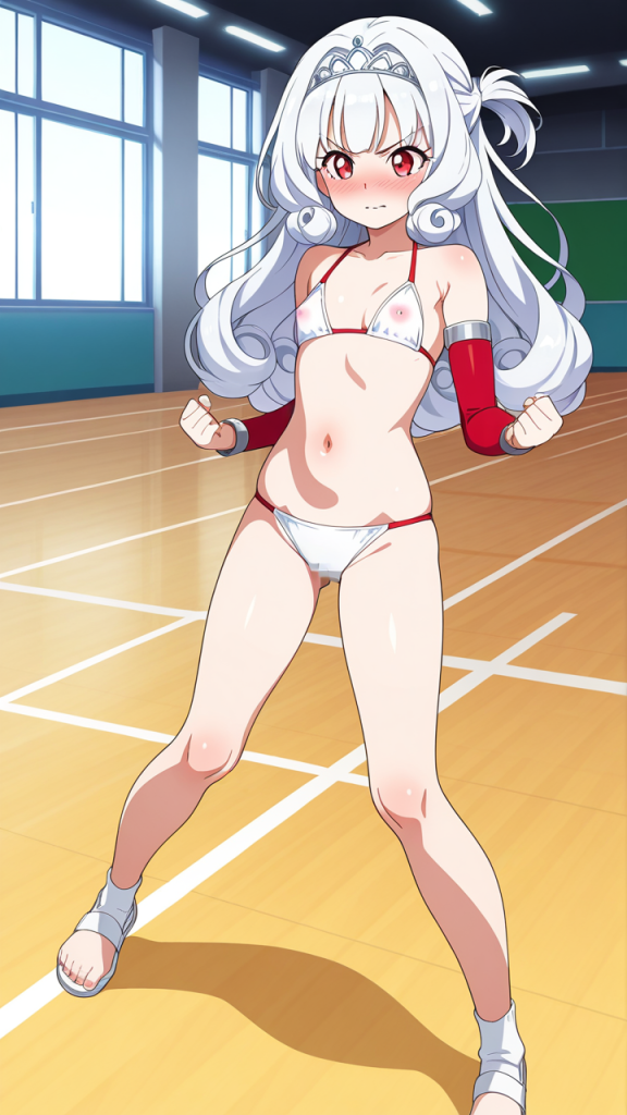 美少女,おっぱい,おしり,体操服,ブルマ,体育,,白髪のハーフアップ、毛先にふんわりした柔らかさ,赤い瞳、細めのクールな目,小柄でむっちりした体型,赤と白のツートンビキニ、白いビーチサンダル、額にシルバーのティアラ型ヘッドドレス、腕に赤いアームリング,勝ち気で負けず嫌い、挑戦的で自信満々な表情