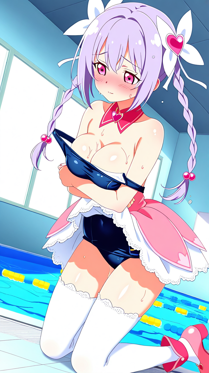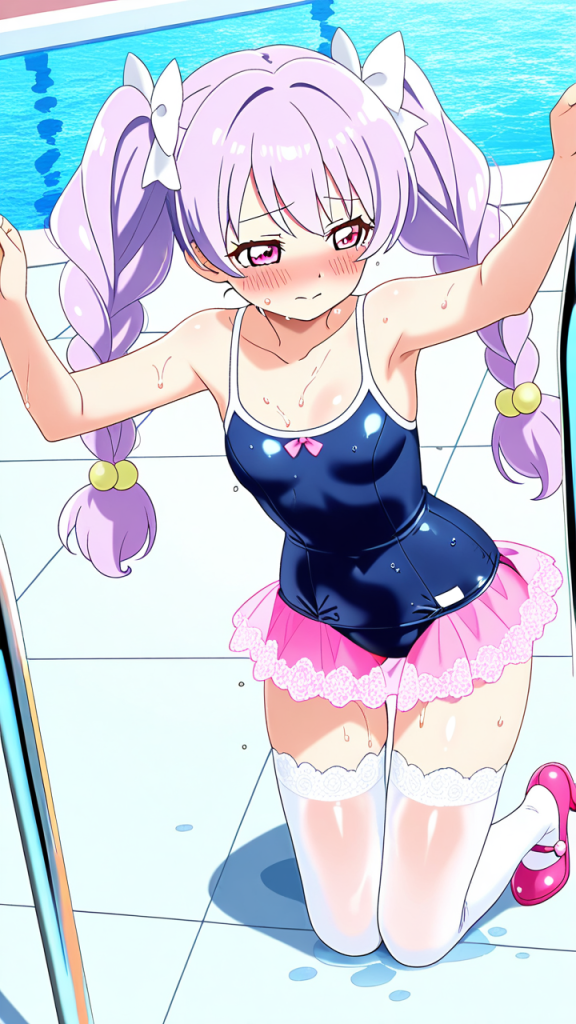美少女,おっぱい,おしり,スク水,スクール水着,水着,,ピンク髪のツインおさげ、毛先に優しいウェーブ,ピンクの瞳、垂れ目気味のハーフ目,巨乳・スレンダー,ピンク基調の魔法少女衣装、胸元に白いリボン、スカートにシフォンレース、白いニーハイソックス、ピンク色のマジカルシューズ、髪に薄紫の花飾り,甘えんぼで可愛らしく、無邪気で依存的