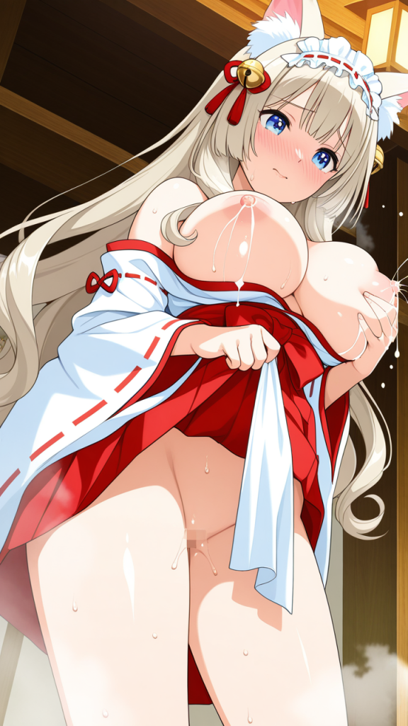 美少女,おっぱい,おしり,M字開脚,食い込み,乳首,パンツ,くぱぁ,母乳,ミルク,,プラチナ髪の内巻きセミロング,青い瞳の大きなぱっちり目,グラマラス,朱色と白の巫女服、狐耳ヘッドバンド、腰に白い鈴飾り,純粋無垢で優しく、控えめながらも芯の強さを持つ