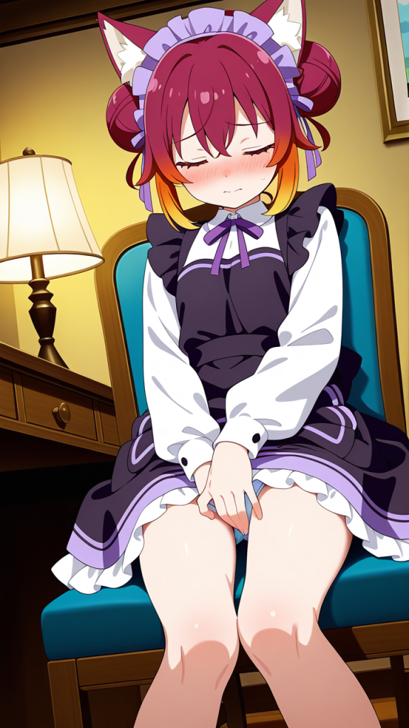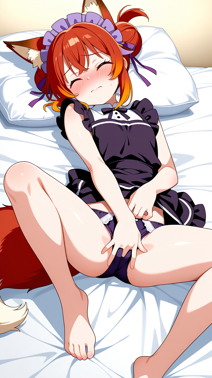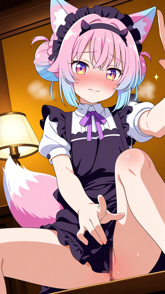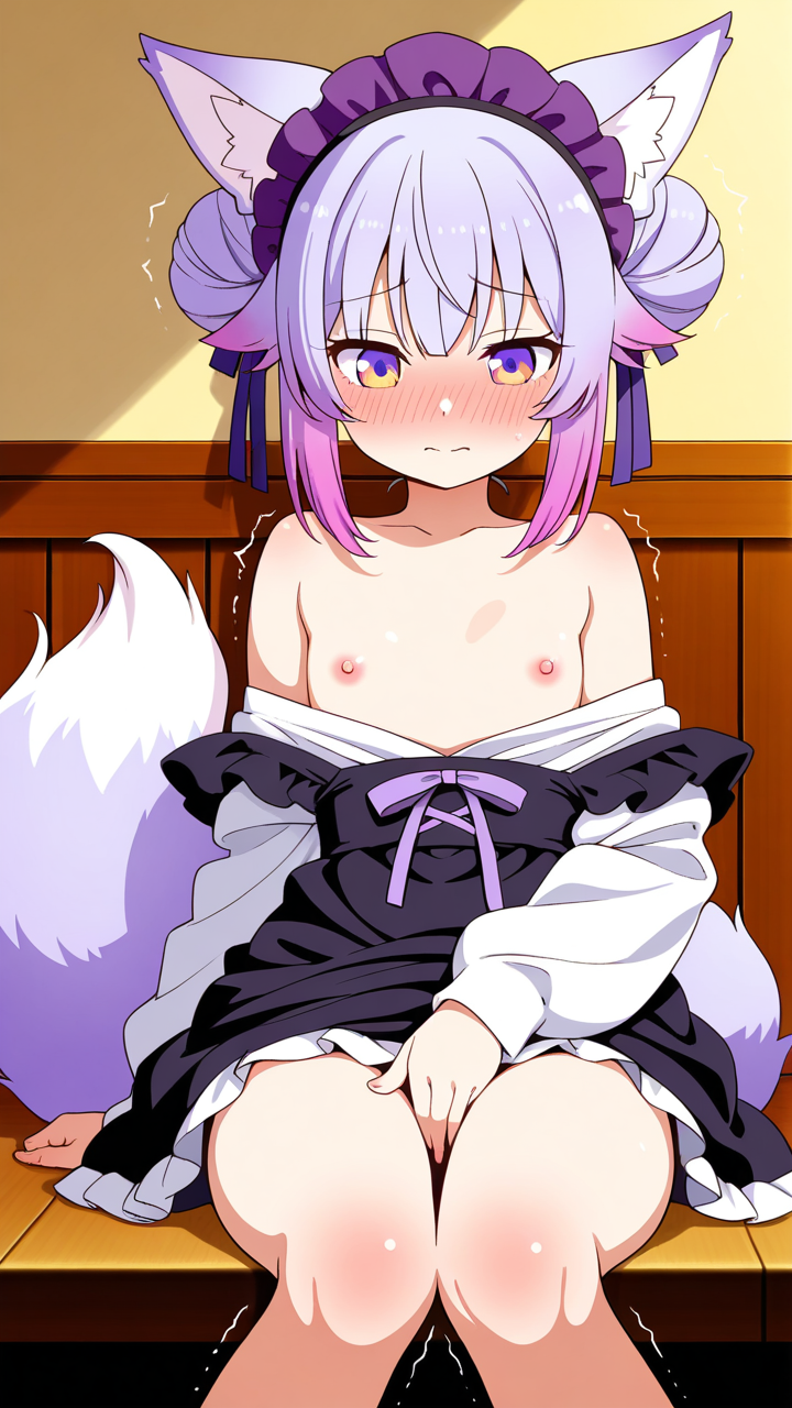 美少女,おっぱい,おしり,M字開脚,乳首,パンツ,くぱぁ,オナニー,自慰,指,マスターベーション,,マゼンタ色のお団子ヘア、毛先にふんわりした柔らかさ,琥珀色の大きなぱっちり目,ロリ体型,黒と紫のドラゴンメイド服、紫のヘッドドレス、黒いエプロン、狐耳ヘッドバンド、紫のリボン装飾,恥ずかしがり屋で控えめ、照れやすい
