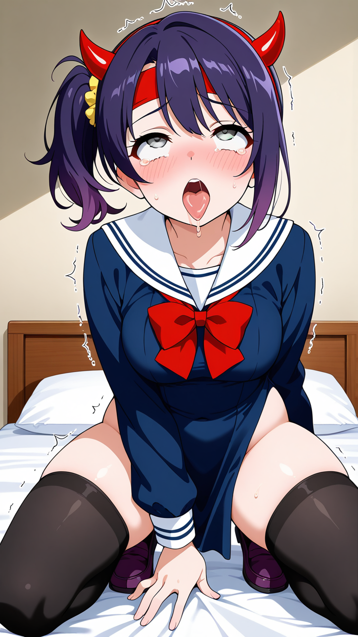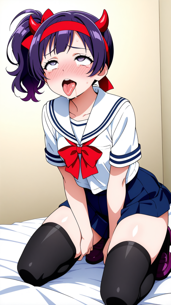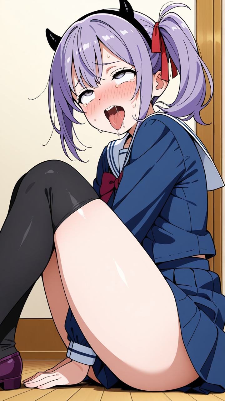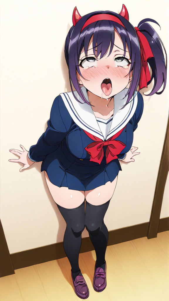 美少女,おっぱい,おしり,乳首,アヘ顔,白目,舌出し,よだれ,,紫髪のサイドポニーテール、毛先に軽くウェーブ,銀色の瞳、細めのクールな目,巨乳・むっちり体型,紺色のセーラー服、白いセーラーカラー、赤いリボン、悪魔の角カチューシャ、黒いニーハイソックス、紫色のローファー,勝ち気で負けず嫌い、自信に満ちた表情
