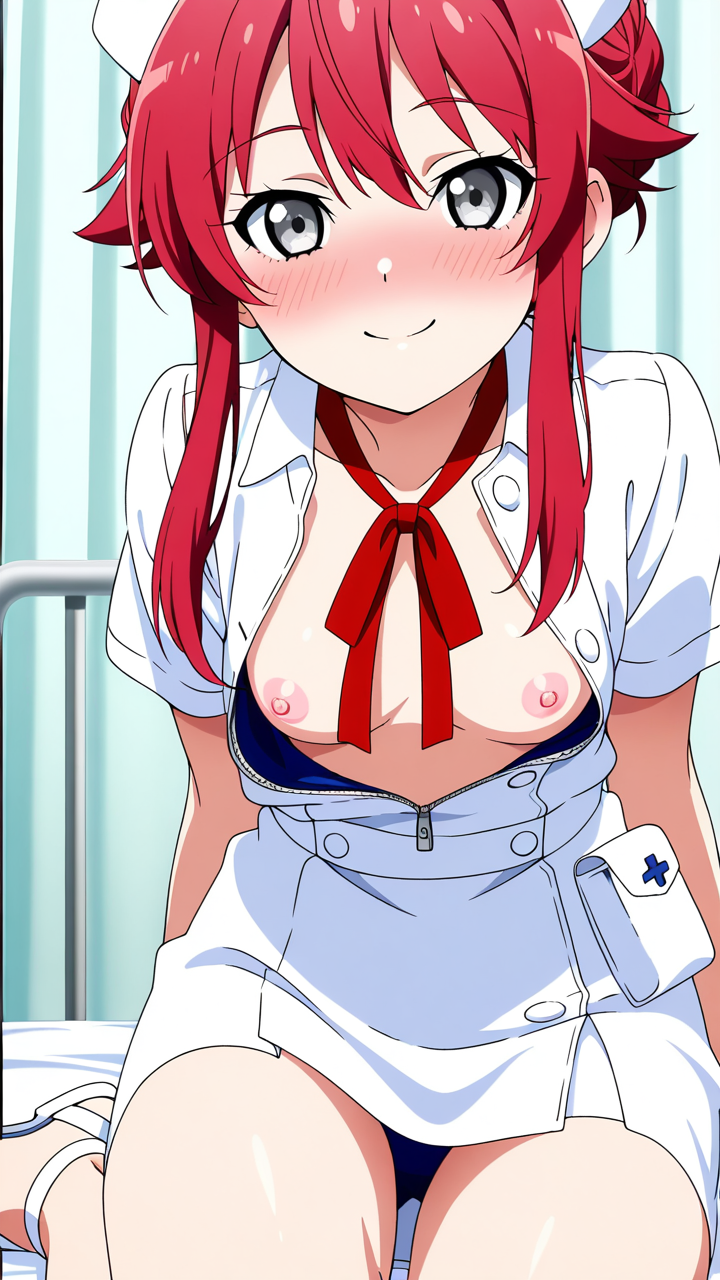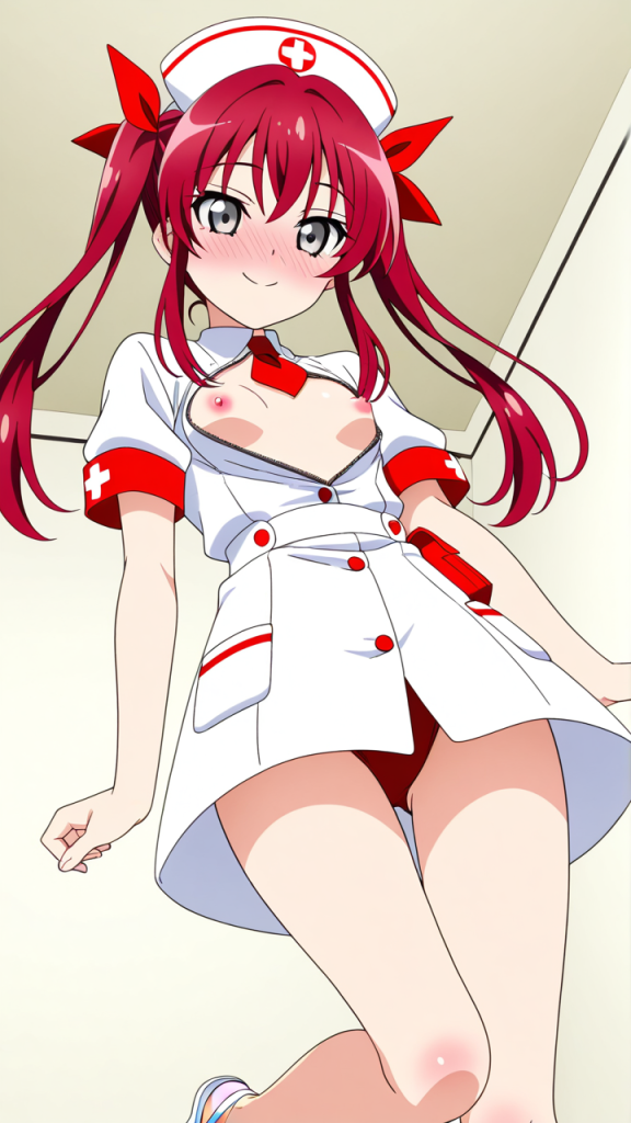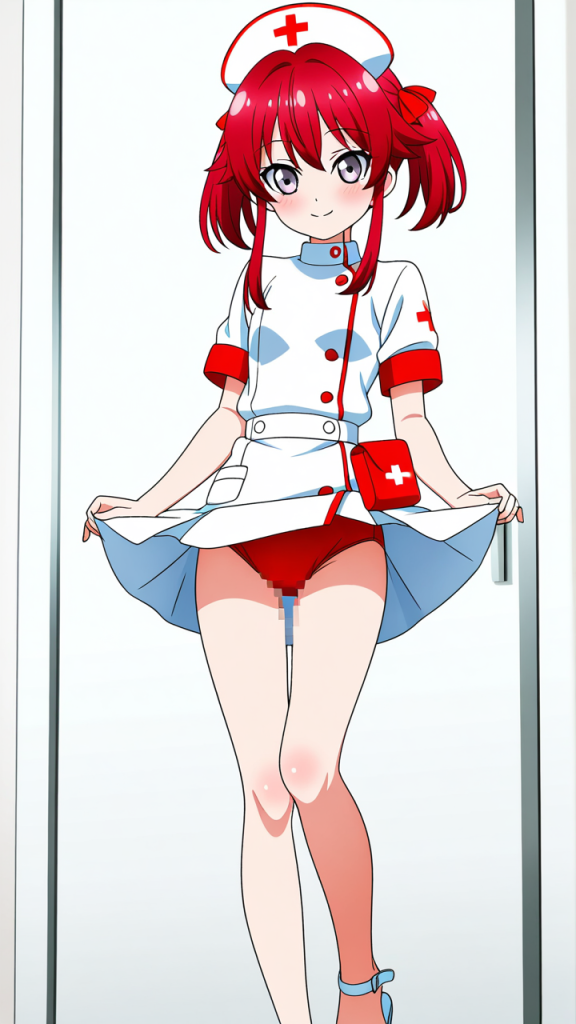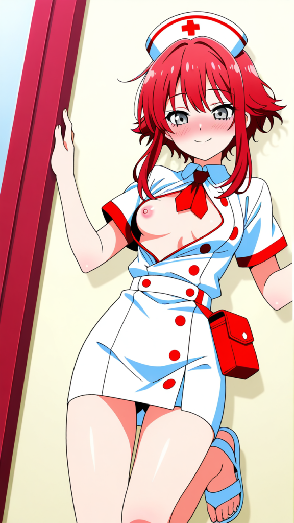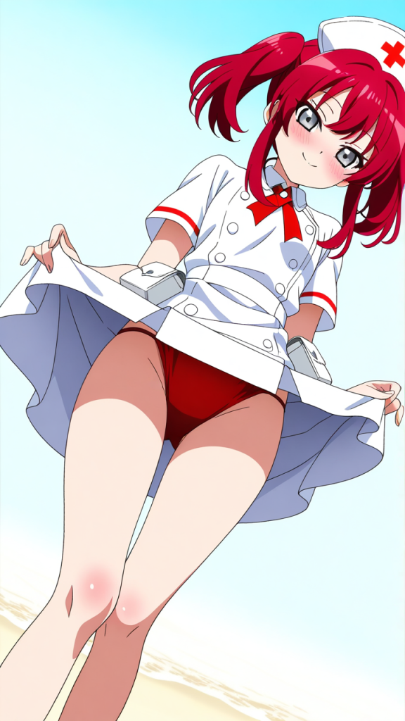 美少女,おっぱい,乳首,ナース,ナース服,看護師,コスプレ,,赤髪のアップスタイル、サイドの後れ毛がふんわり,銀色の瞳、垂れ目気味のハーフ目,細身・長身モデル体型,白と赤のカラーブロック水着(ビキニ)、赤い大きなリボンタイ、白いビーチサンダル、腰に赤い小ぶりなポーチ,元気系、明るく活発で朗らかな笑顔