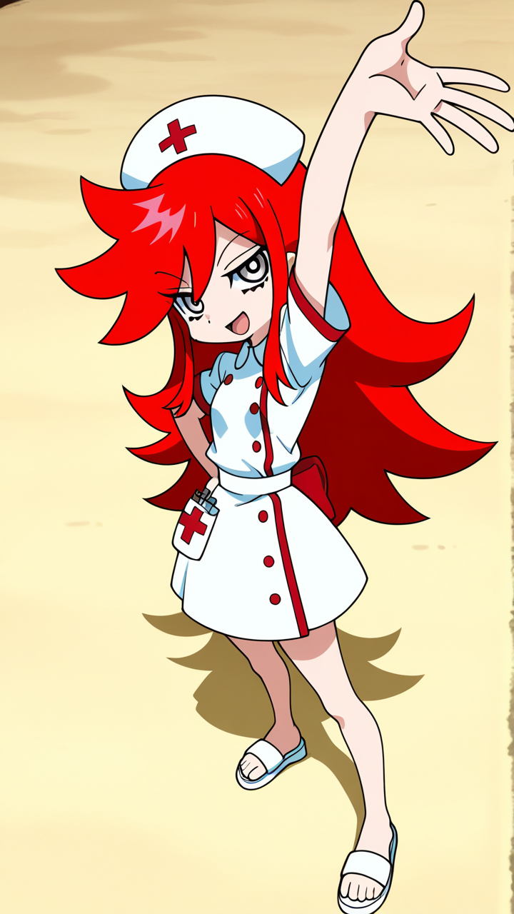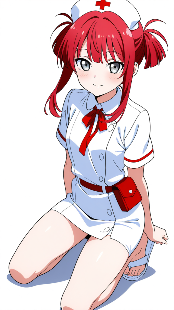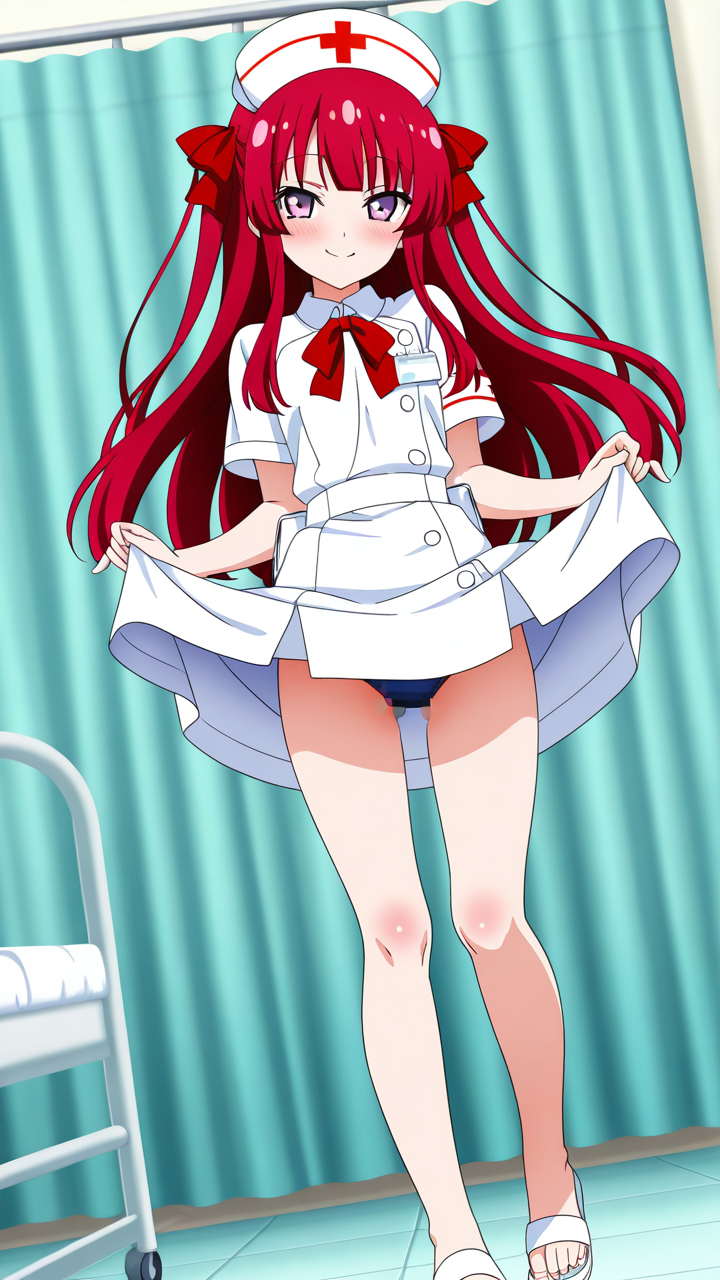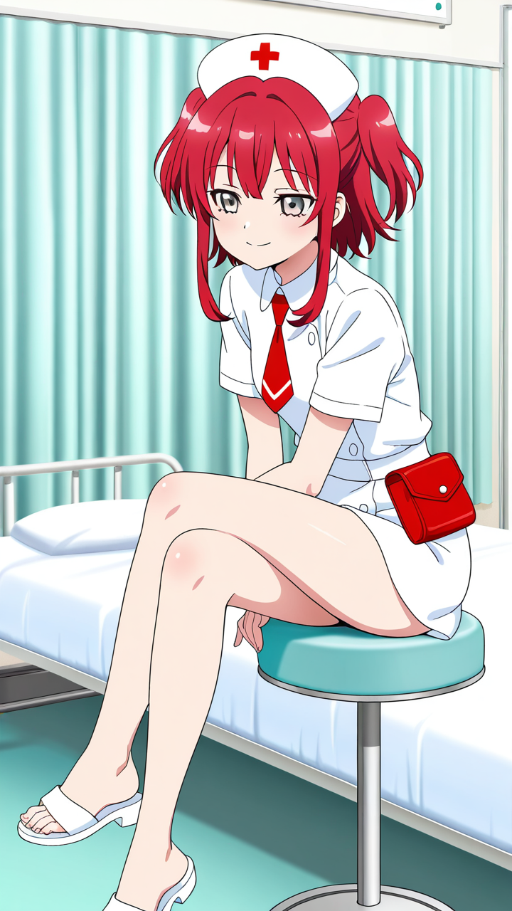 美少女,おっぱい,乳首,ナース,ナース服,看護師,コスプレ,,赤髪のアップスタイル、サイドの後れ毛がふんわり,銀色の瞳、垂れ目気味のハーフ目,細身・長身モデル体型,白と赤のカラーブロック水着(ビキニ)、赤い大きなリボンタイ、白いビーチサンダル、腰に赤い小ぶりなポーチ,元気系、明るく活発で朗らかな笑顔