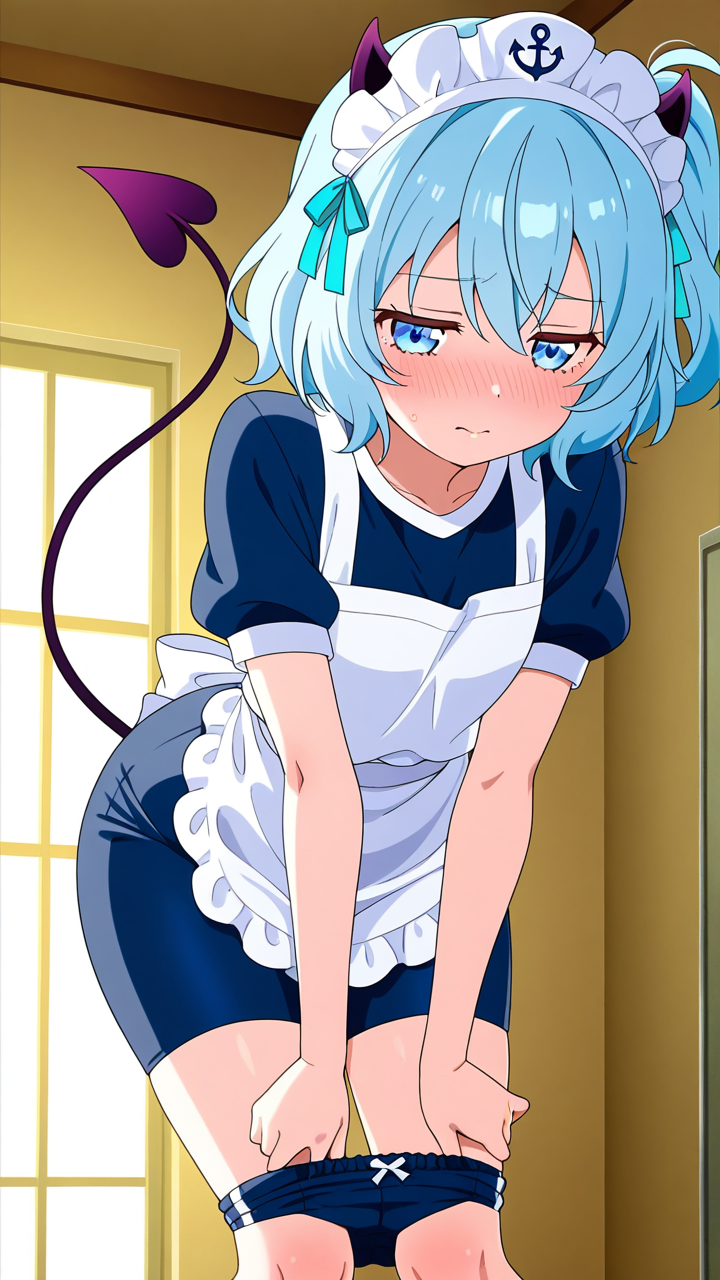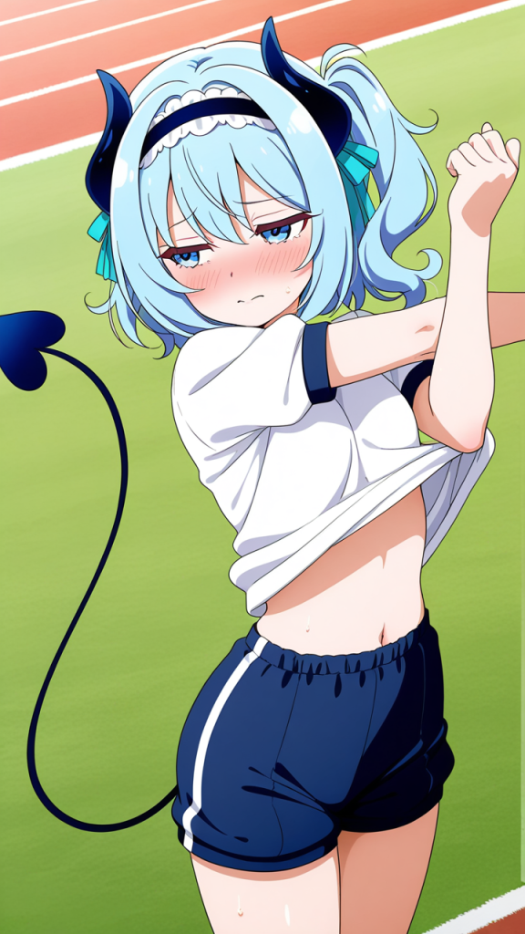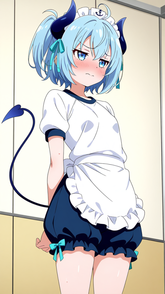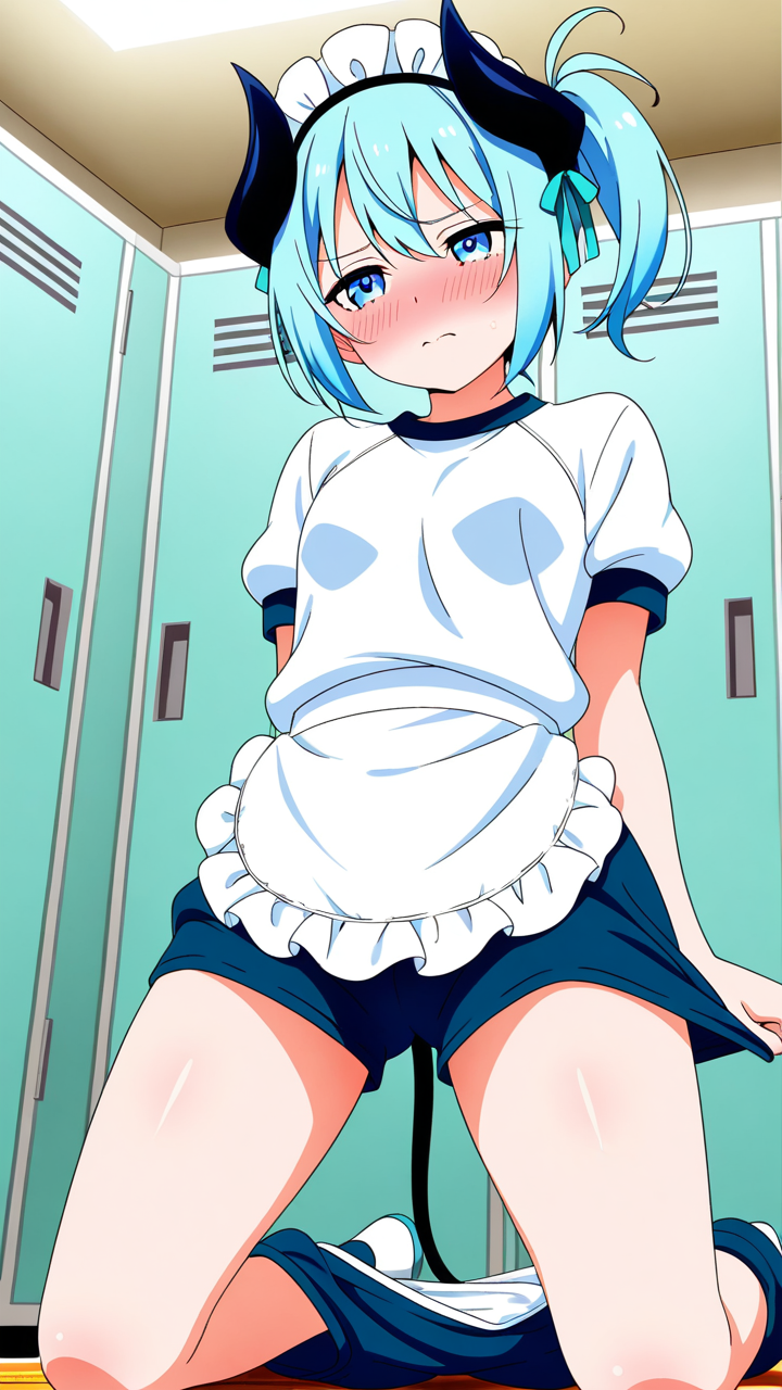 美少女,おっぱい,おしり,体操服,ブルマ,体育,,水色のサイドテール,青い瞳の垂れ目気味のハーフ目,小柄でむっちりとした体型,黒と水色のメイド服、悪魔の角カチューシャ、白いエプロン、水色のリボン装飾,ツンデレで素直になれない性格、照れ隠しで意地っぱり