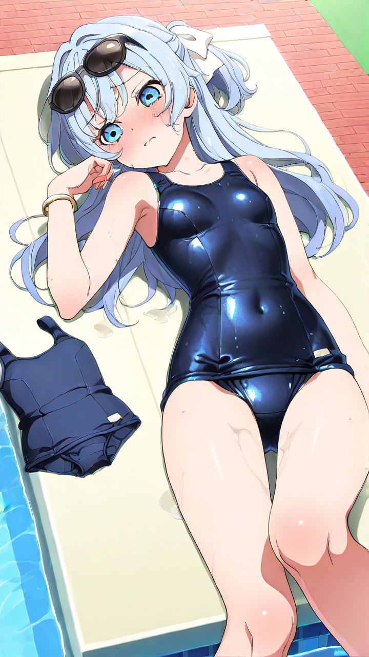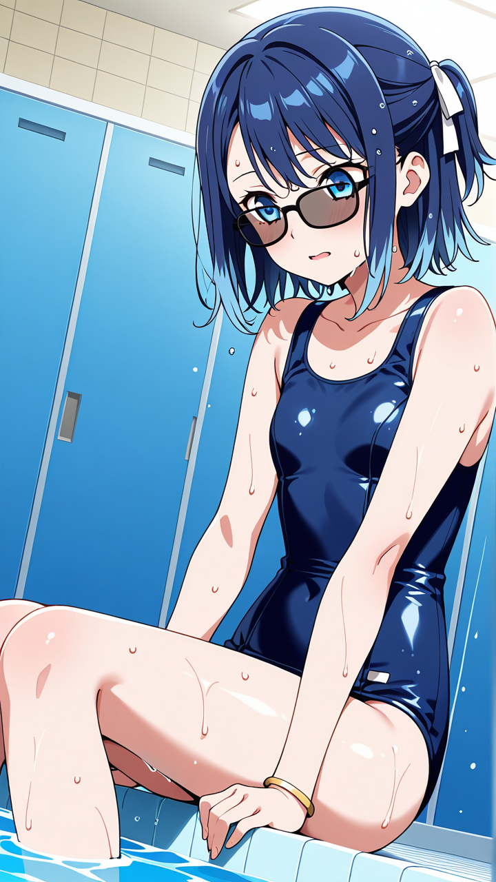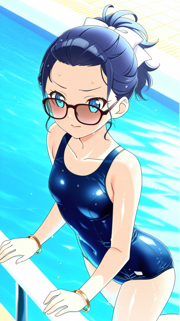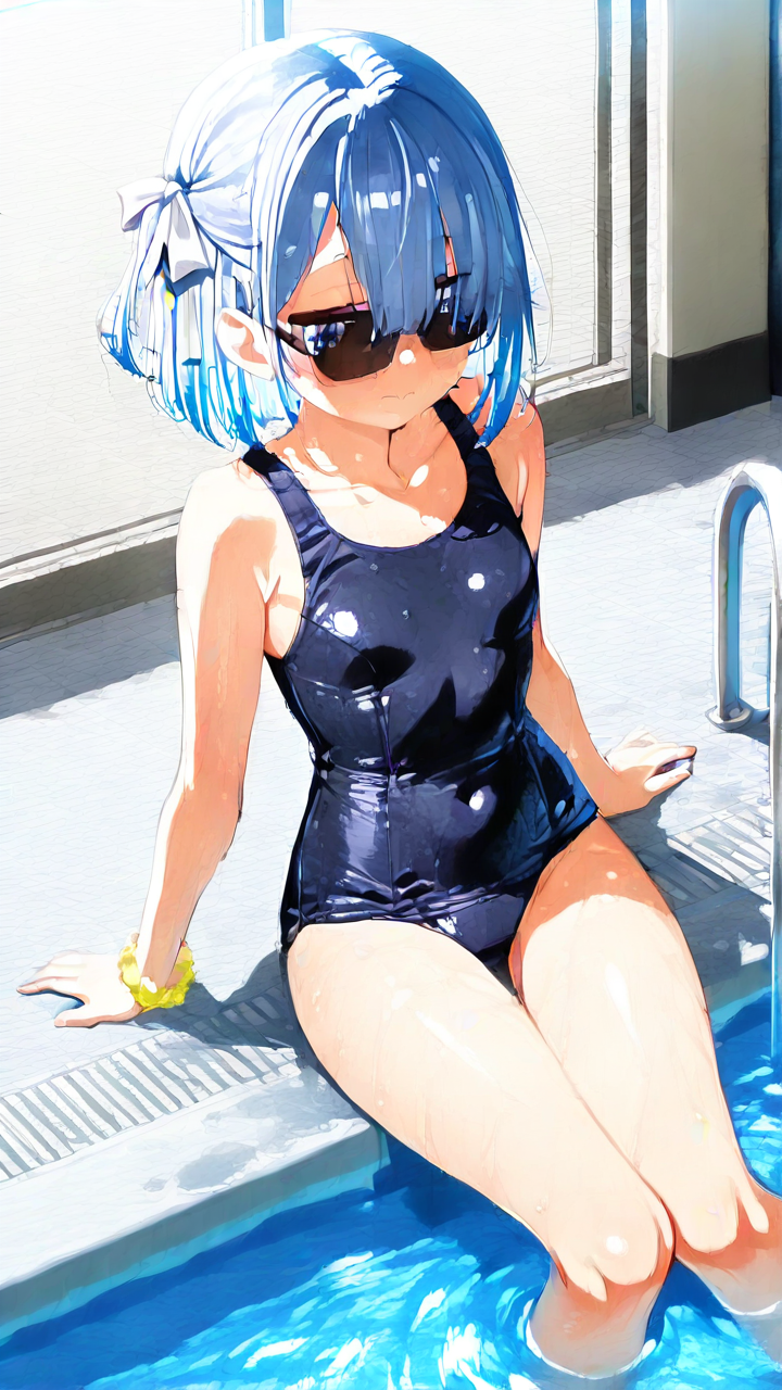 美少女,おっぱい,おしり,スク水,スクール水着,水着,,青髪のハーフアップ、毛先にふんわりした柔らかさ,青い瞳、細めのクールな目,貧乳・小柄で華奢な体型,紺色のスクール水着、白いリボン、黒いサングラス、腕に金色のリストバンド,気高いお嬢様、上品だが時に傲慢な態度