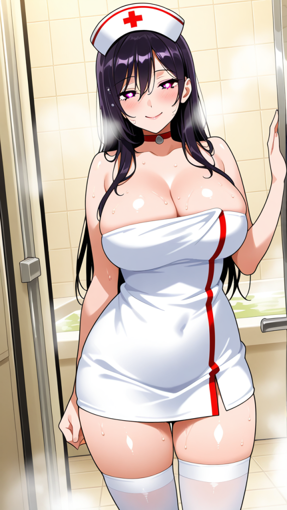 美少女,おっぱい,おしり,乳首,風呂,入浴,温泉,シャワー,,紫髪のセミロング、毛先にわずかな内巻き,深紅の瞳、垂れ目気味のハーフ目,巨乳・むっちり体型,黒と白のナース服、深紅色のチョーカー、胸部に赤い十字マーク、白いニーハイソックス、黒いナースシューズ,腹黒系、甘い笑みで相手を翻弄する狡猾な性格